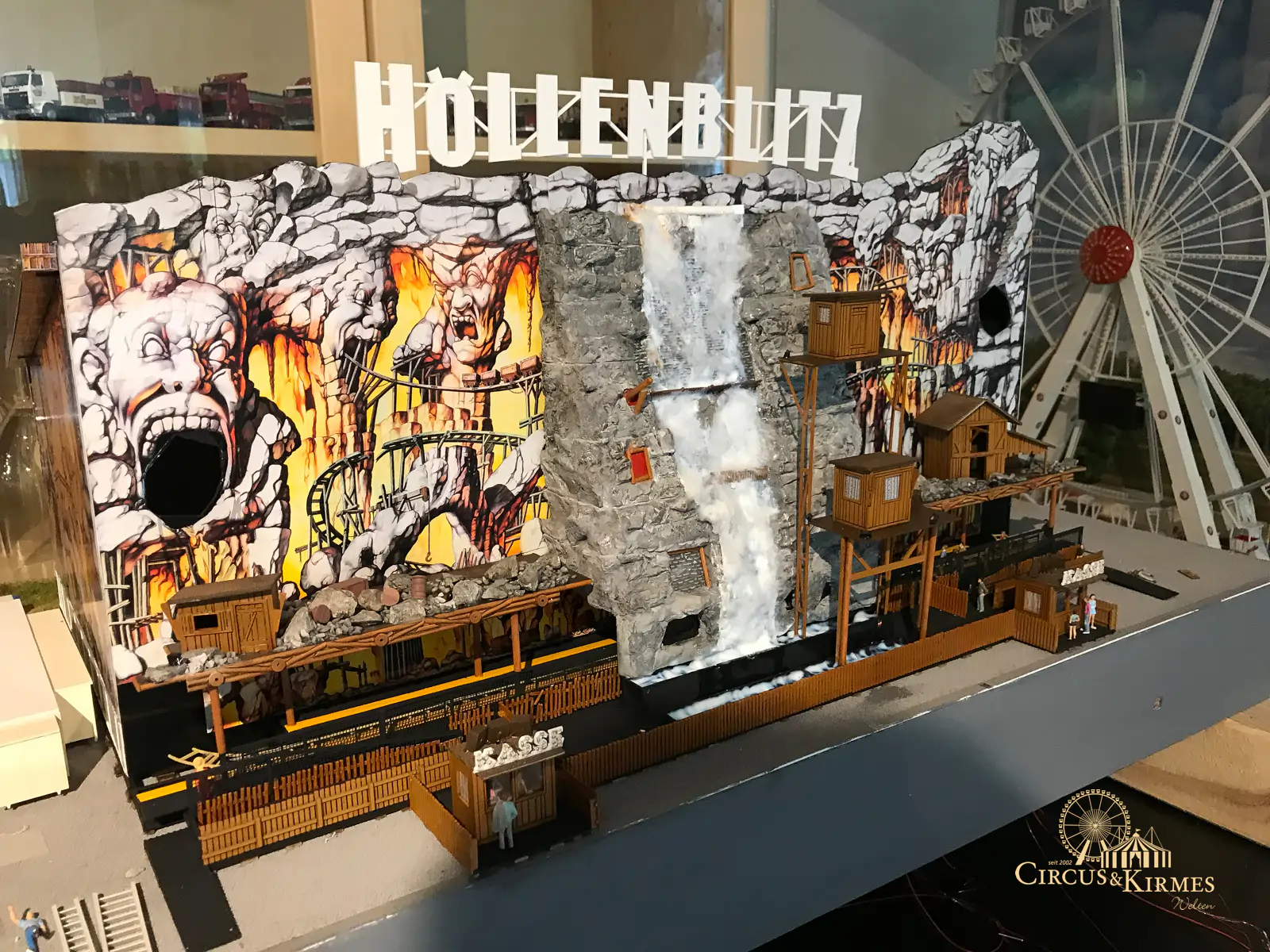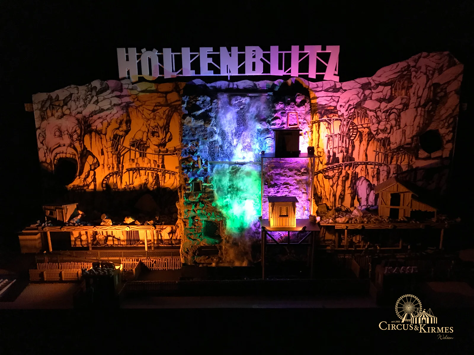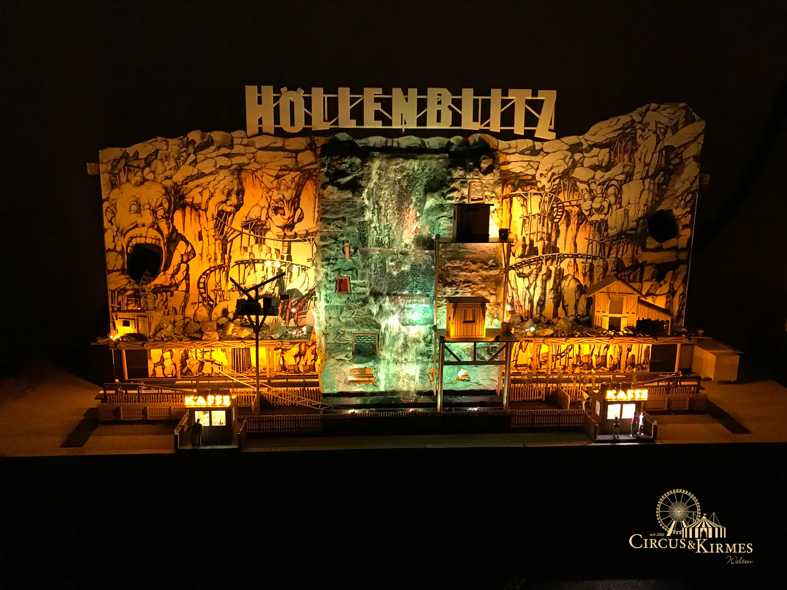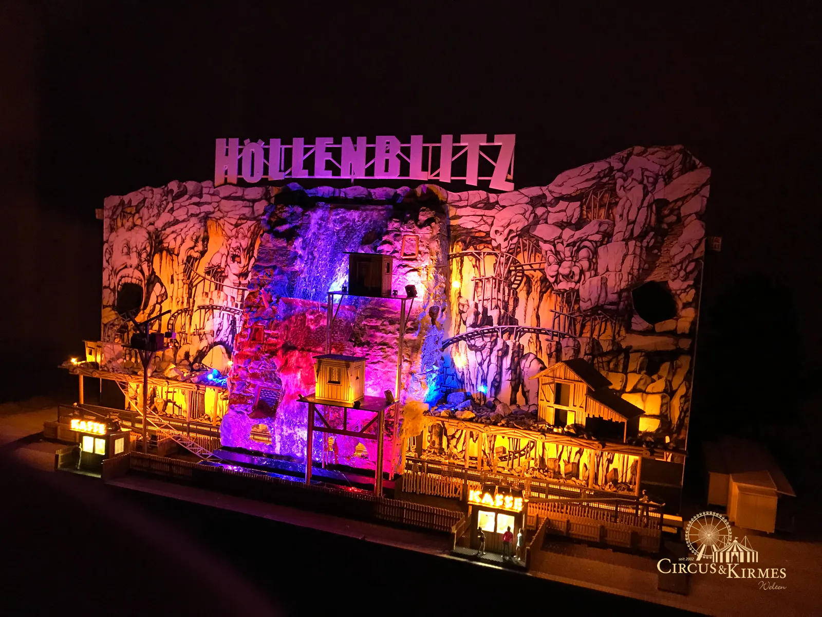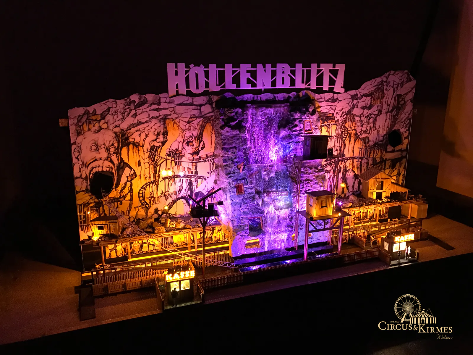 Nach zahlreichen Arbeitsstunden entstand dieses detailgetreue Modell des bekannten Fahrgeschäfts Höllenblitz im Maßstab 1:87. Es handelt sich um einen kompletten Eigenbau – von der Grundkonstruktion über die Antriebs- und Beleuchtungstechnik bis hin zur aufwendigen Gestaltung der Fassade und Szenerie.
