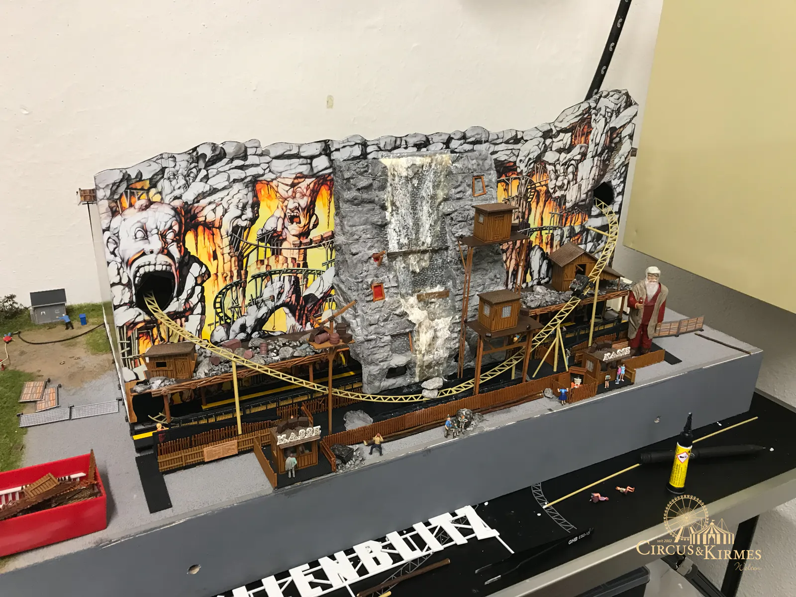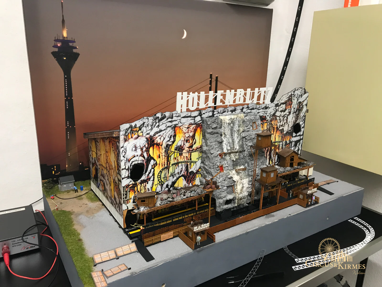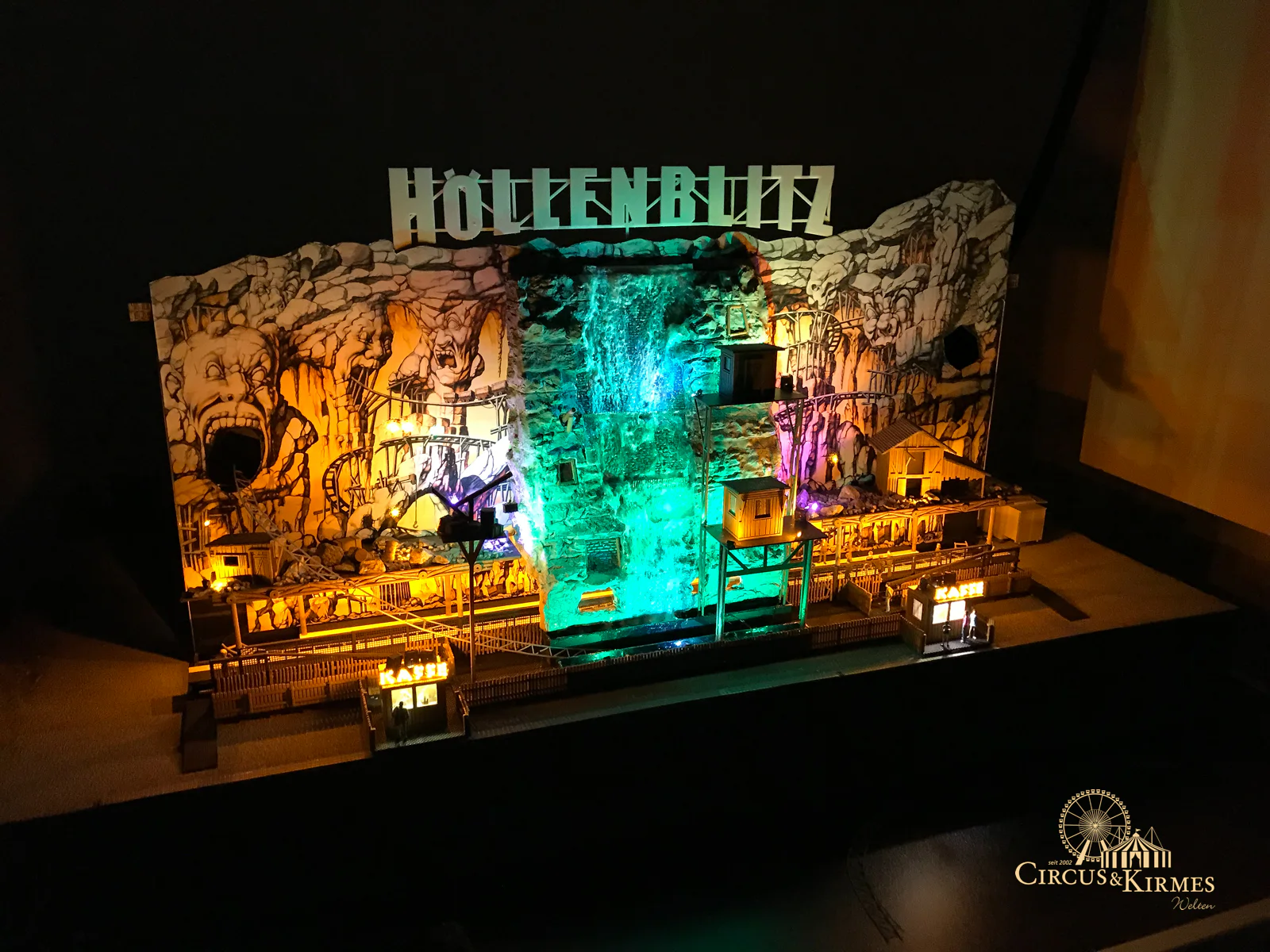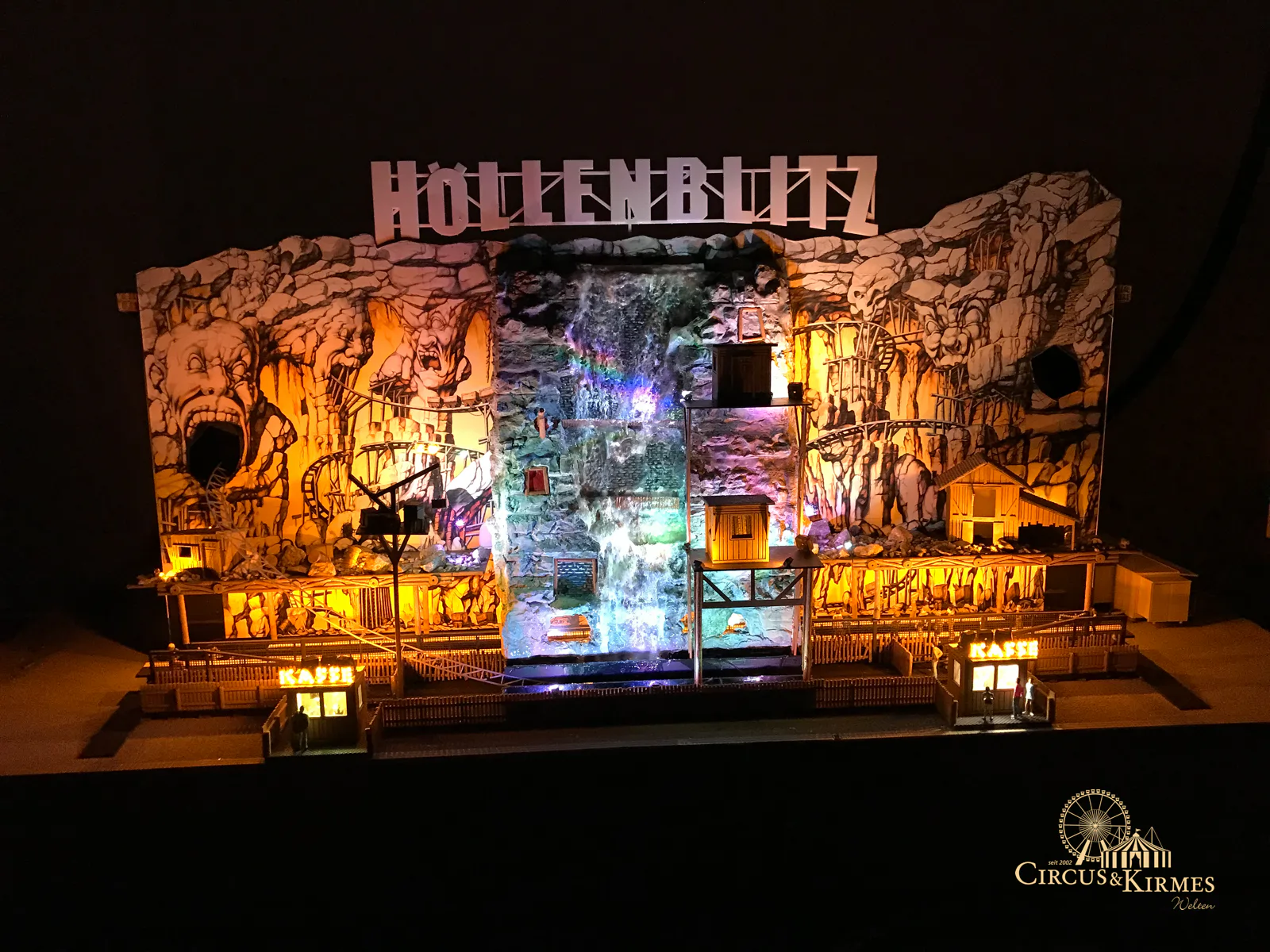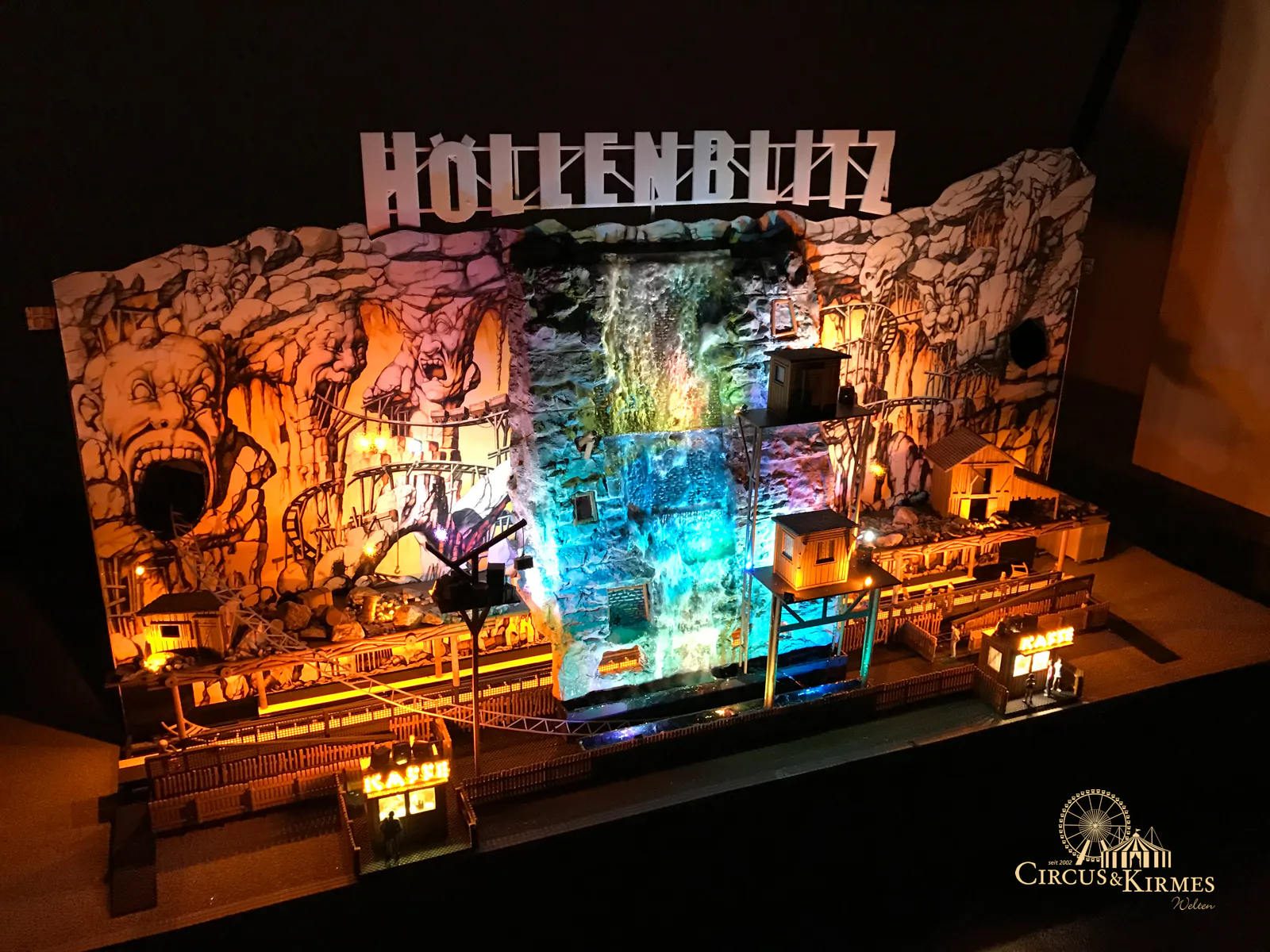 Nach zahlreichen Arbeitsstunden entstand dieses detailgetreue Modell des bekannten Fahrgeschäfts Höllenblitz im Maßstab 1:87. Es handelt sich um einen kompletten Eigenbau – von der Grundkonstruktion über die Antriebs- und Beleuchtungstechnik bis hin zur aufwendigen Gestaltung der Fassade und Szenerie.
