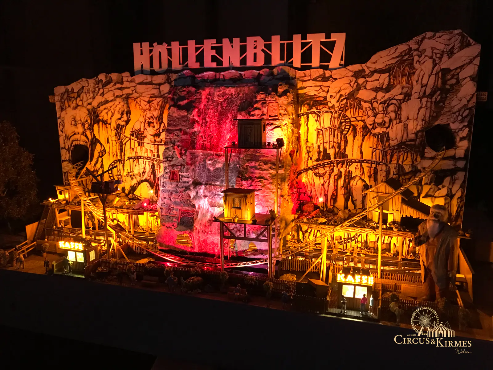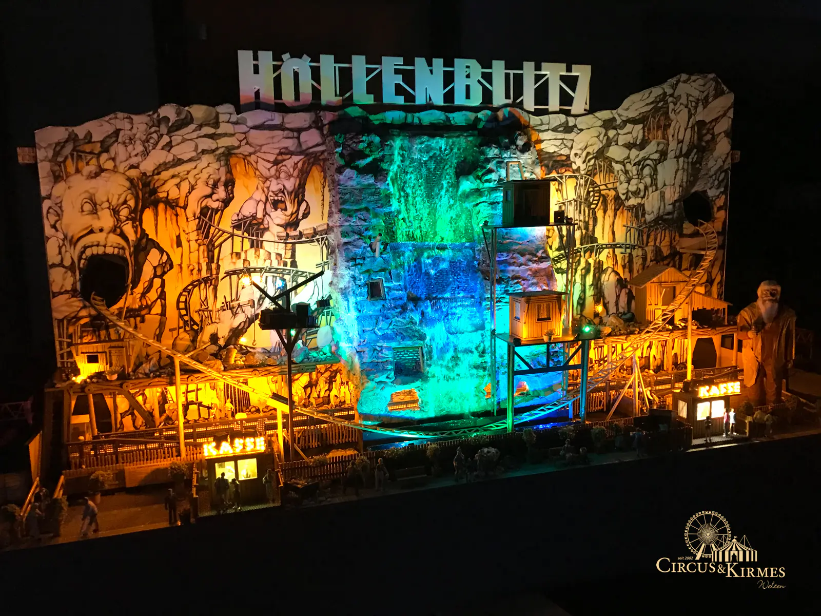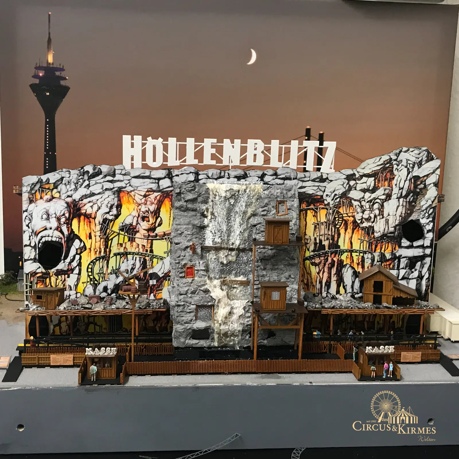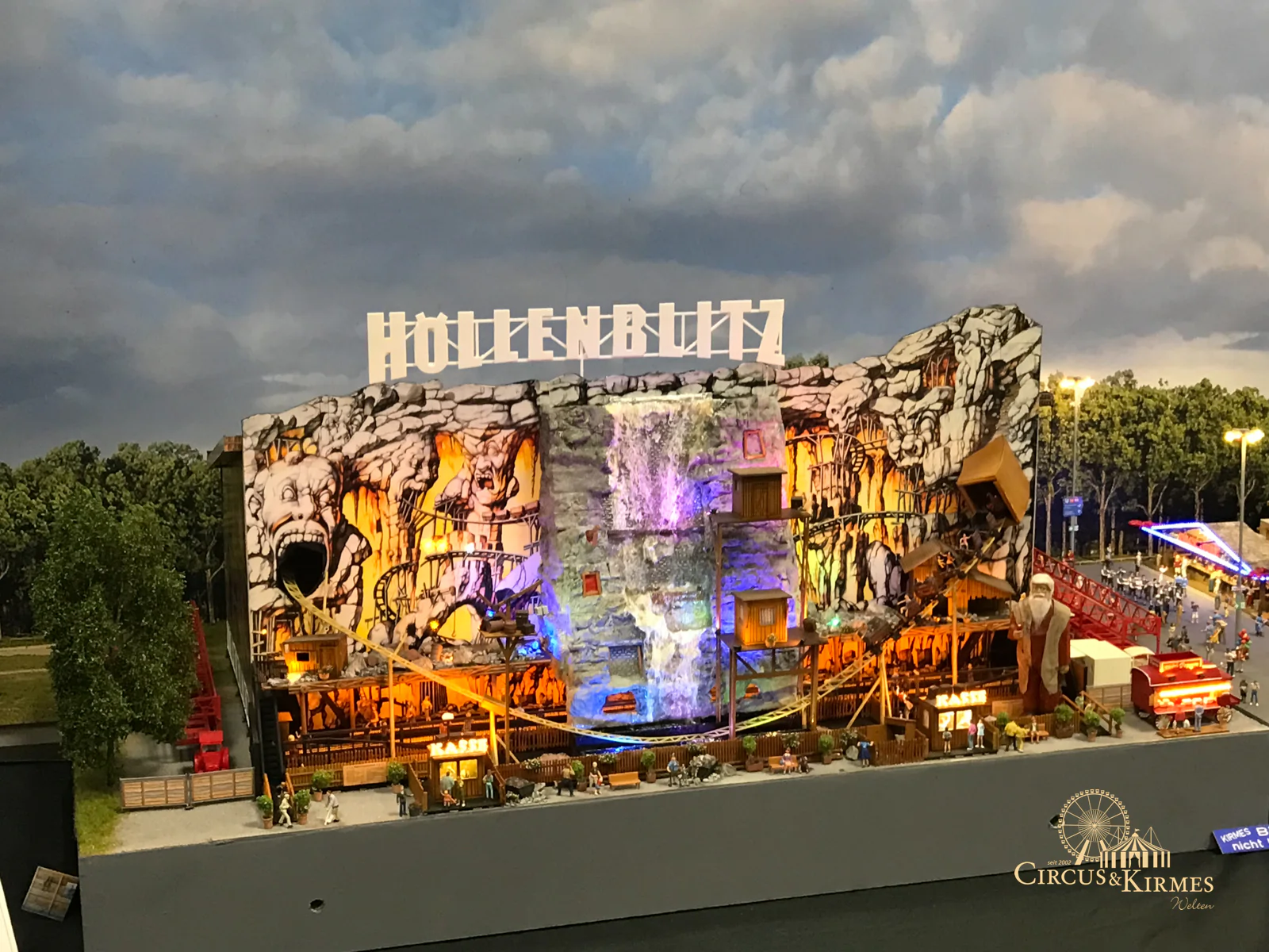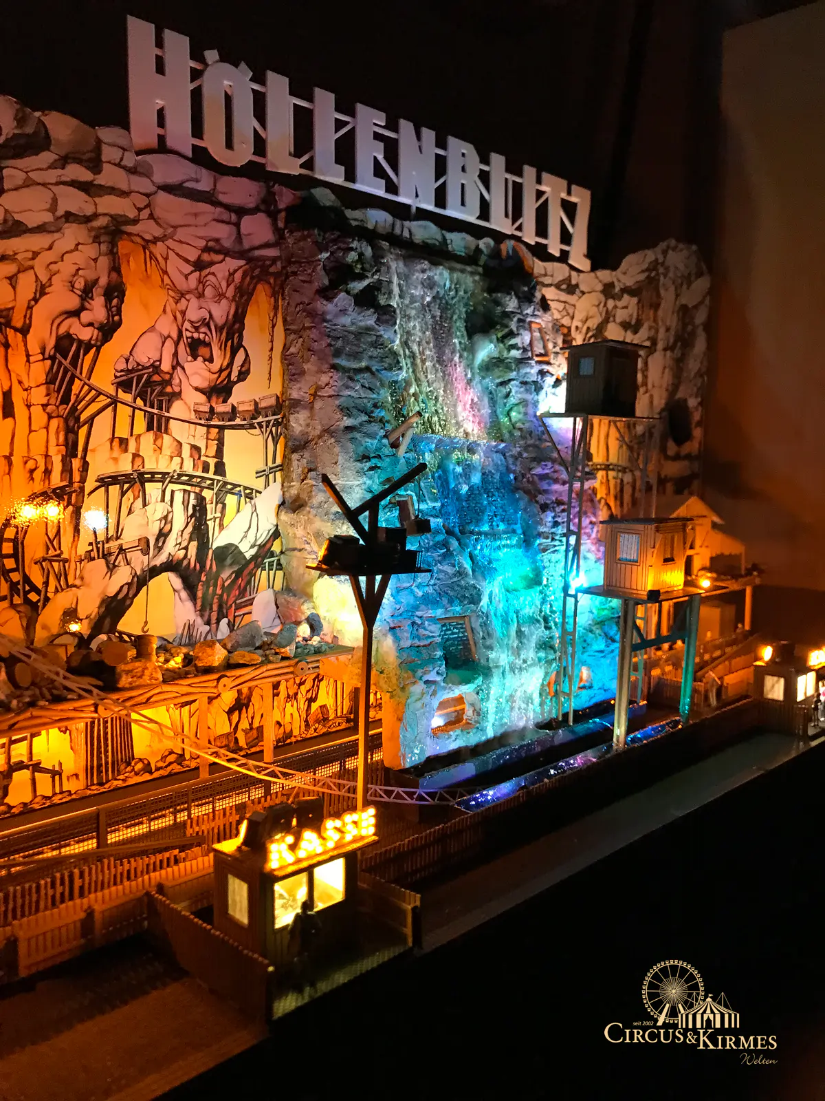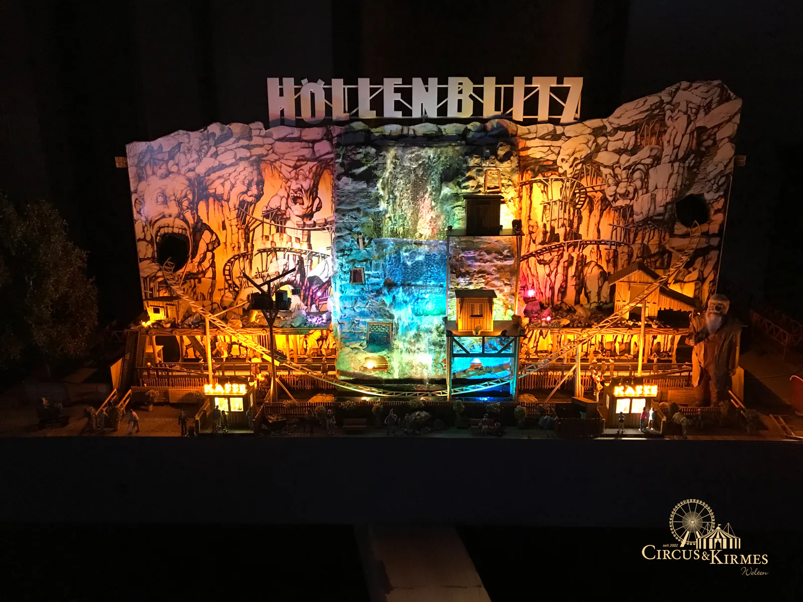 Nach zahlreichen Arbeitsstunden entstand dieses detailgetreue Modell des bekannten Fahrgeschäfts Höllenblitz im Maßstab 1:87. Es handelt sich um einen kompletten Eigenbau – von der Grundkonstruktion über die Antriebs- und Beleuchtungstechnik bis hin zur aufwendigen Gestaltung der Fassade und Szenerie.