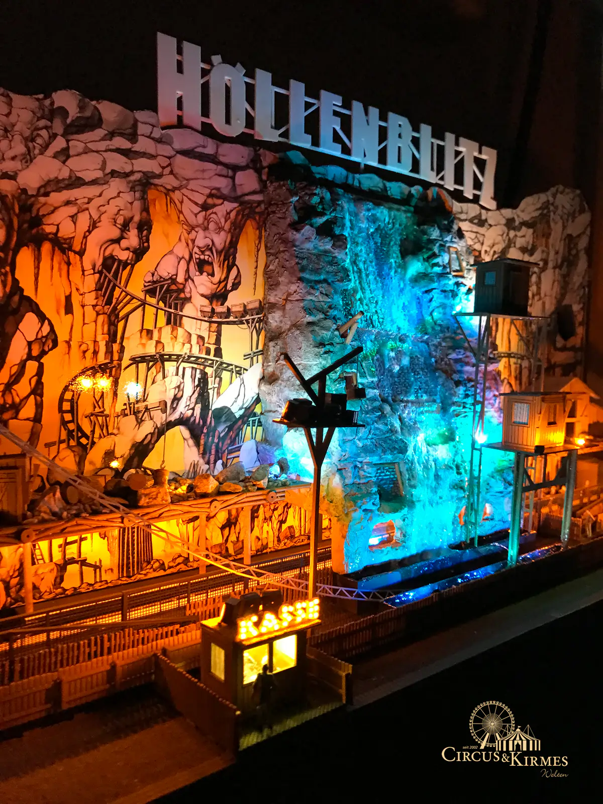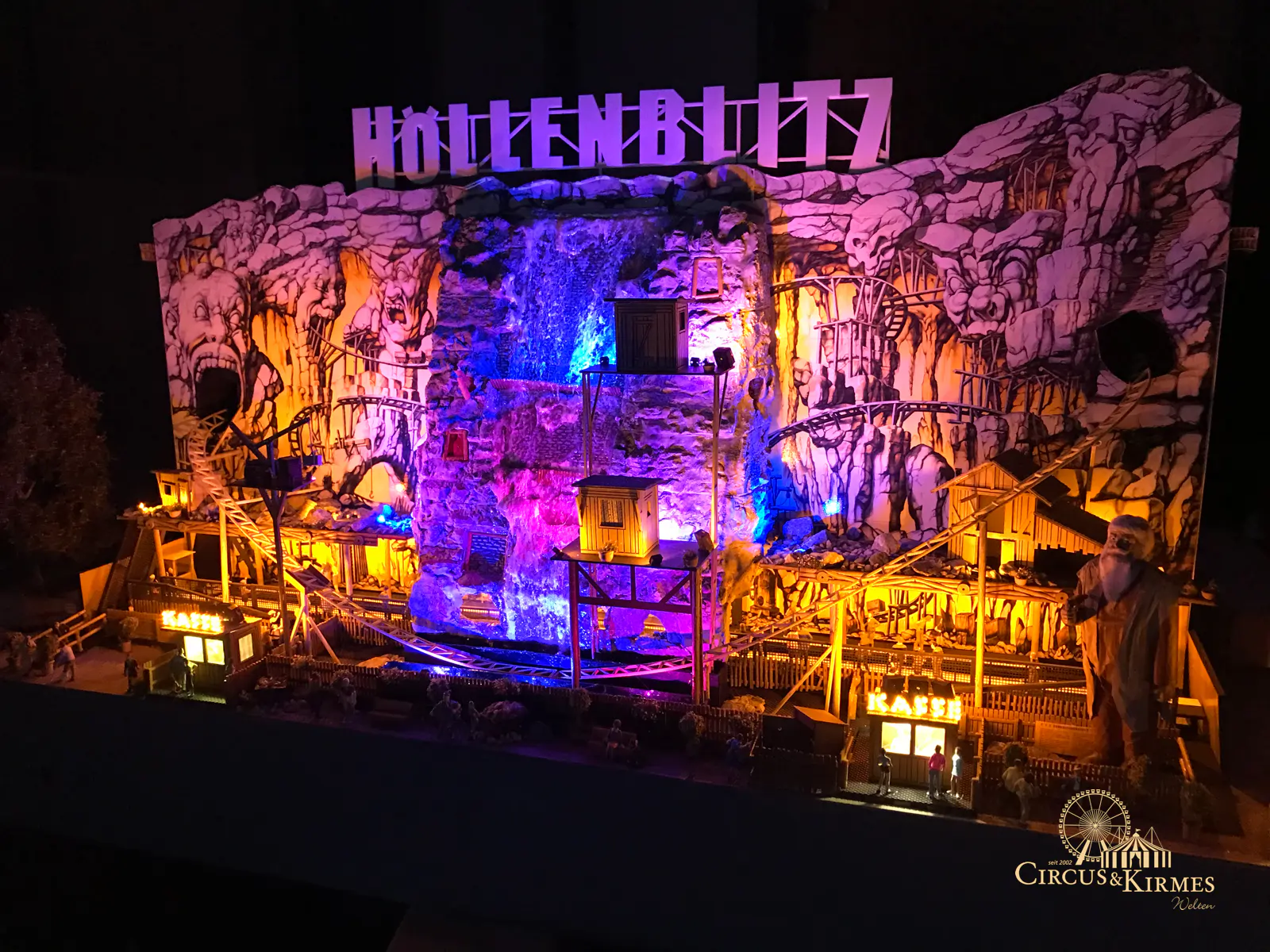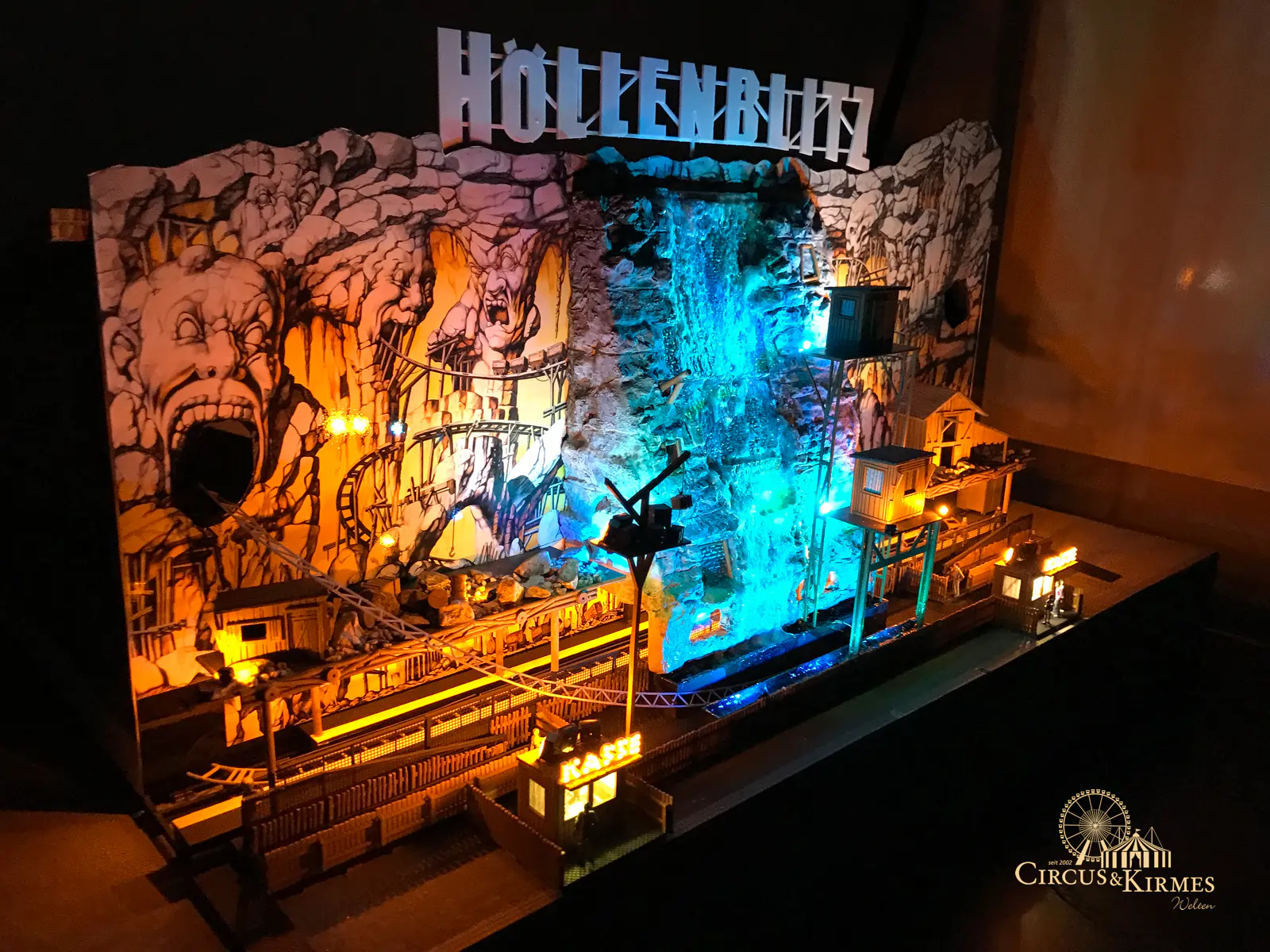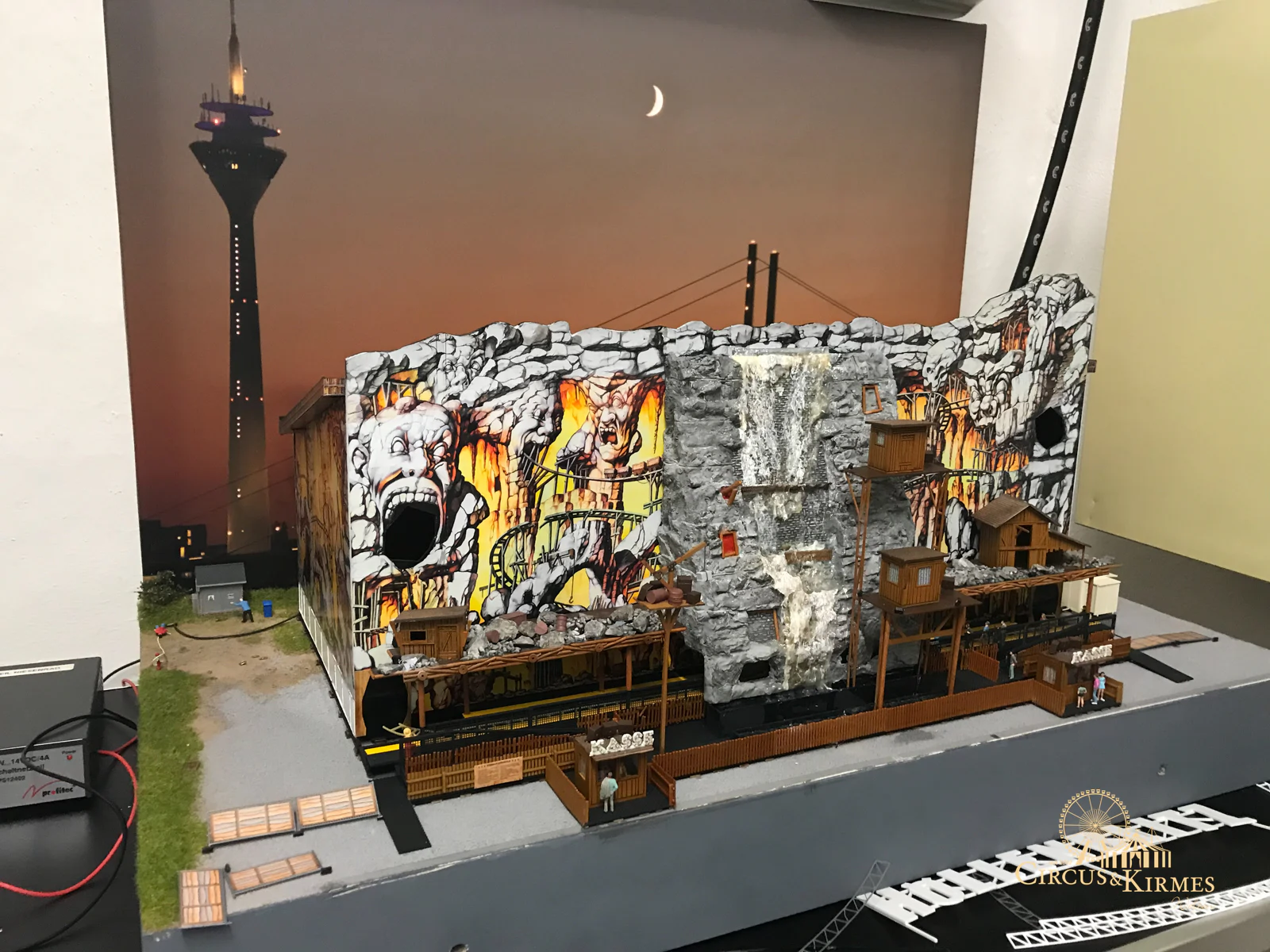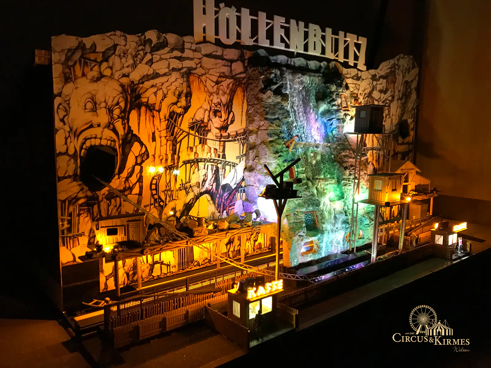 Nach zahlreichen Arbeitsstunden entstand dieses detailgetreue Modell des bekannten Fahrgeschäfts Höllenblitz im Maßstab 1:87. Es handelt sich um einen kompletten Eigenbau – von der Grundkonstruktion über die Antriebs- und Beleuchtungstechnik bis hin zur aufwendigen Gestaltung der Fassade und Szenerie.