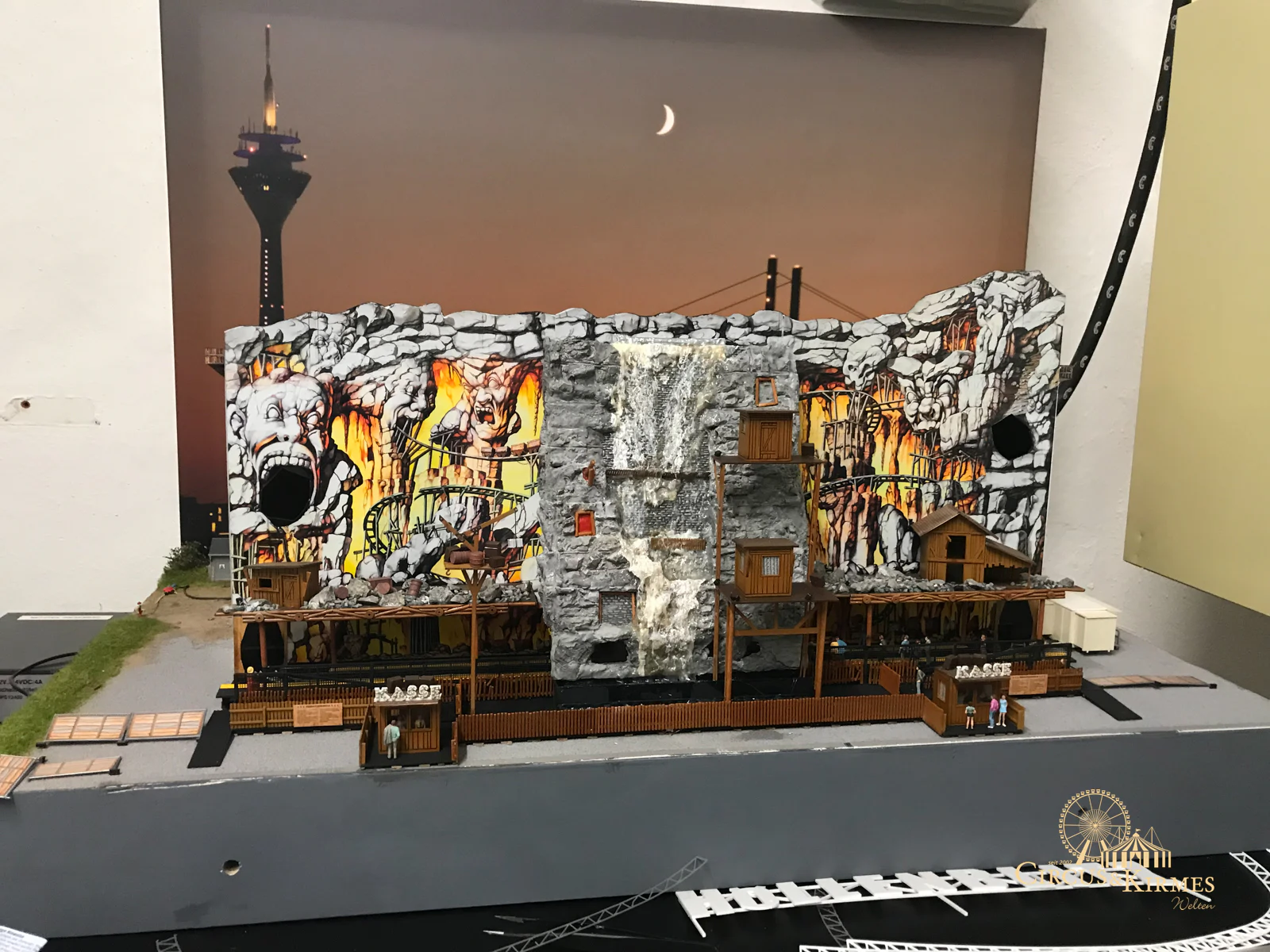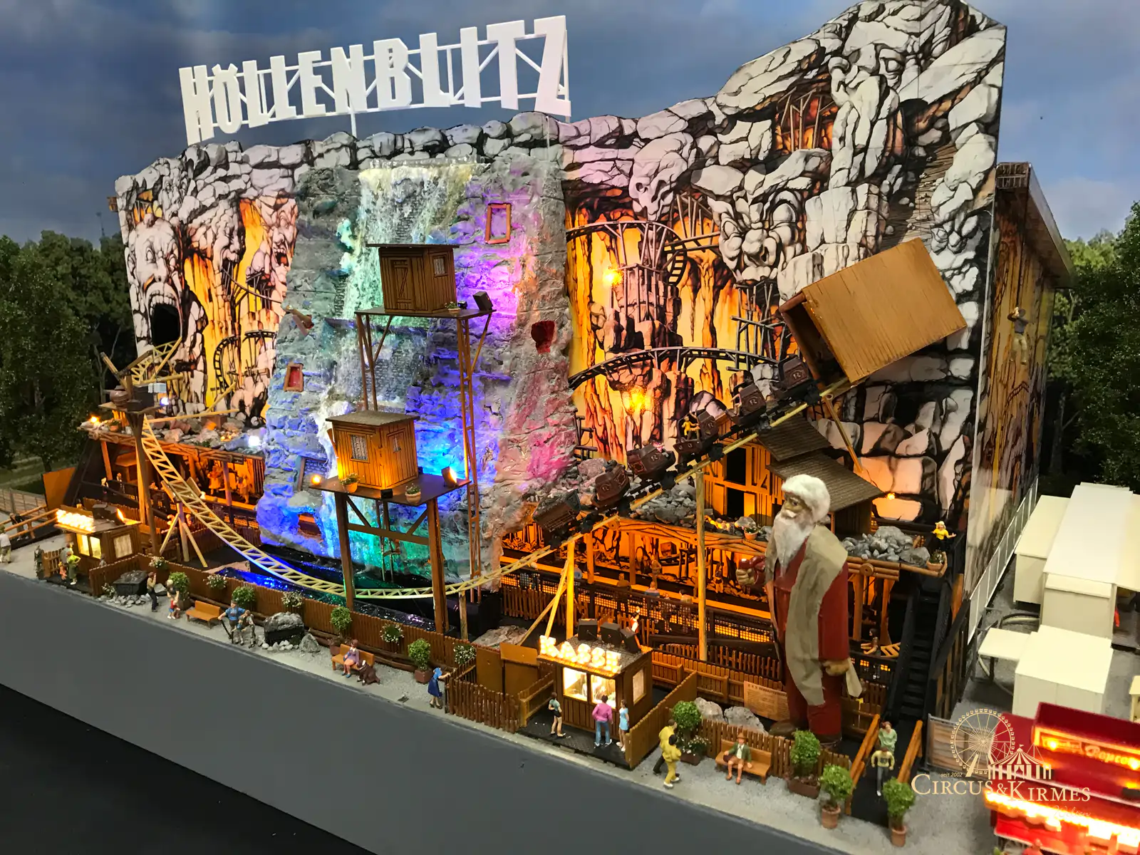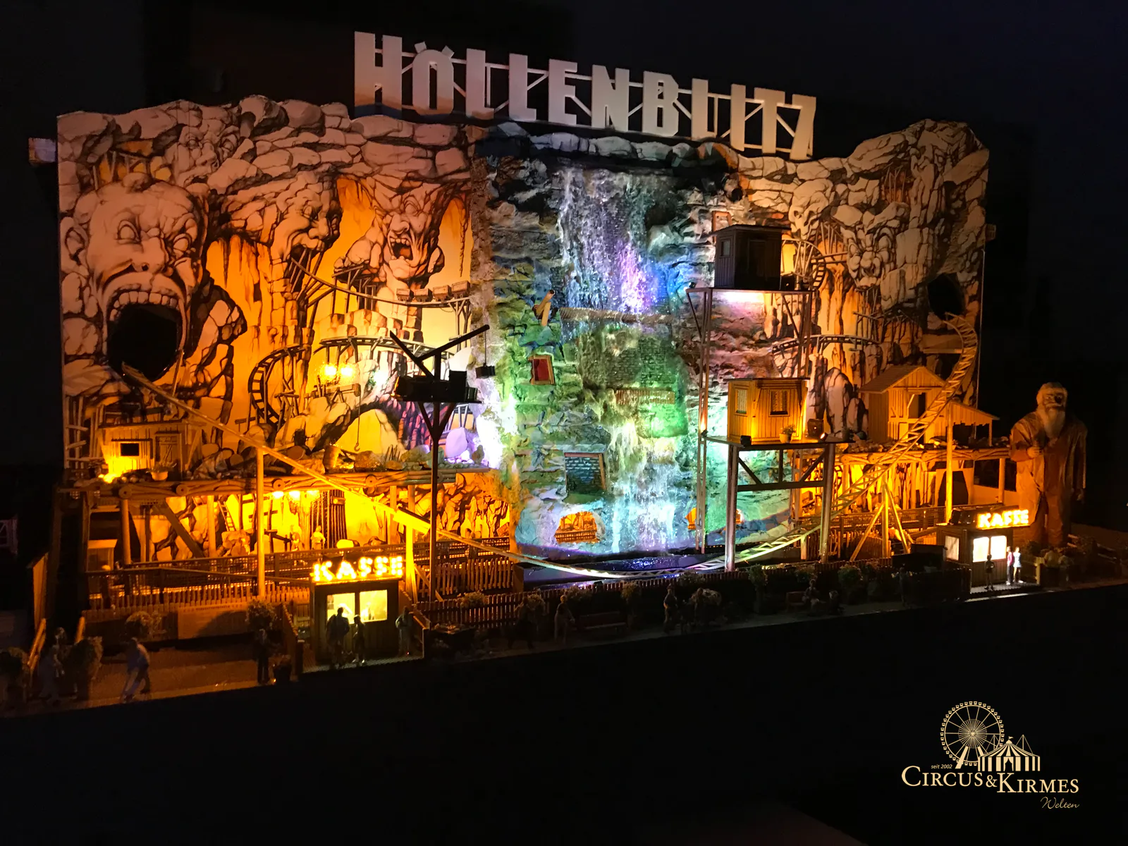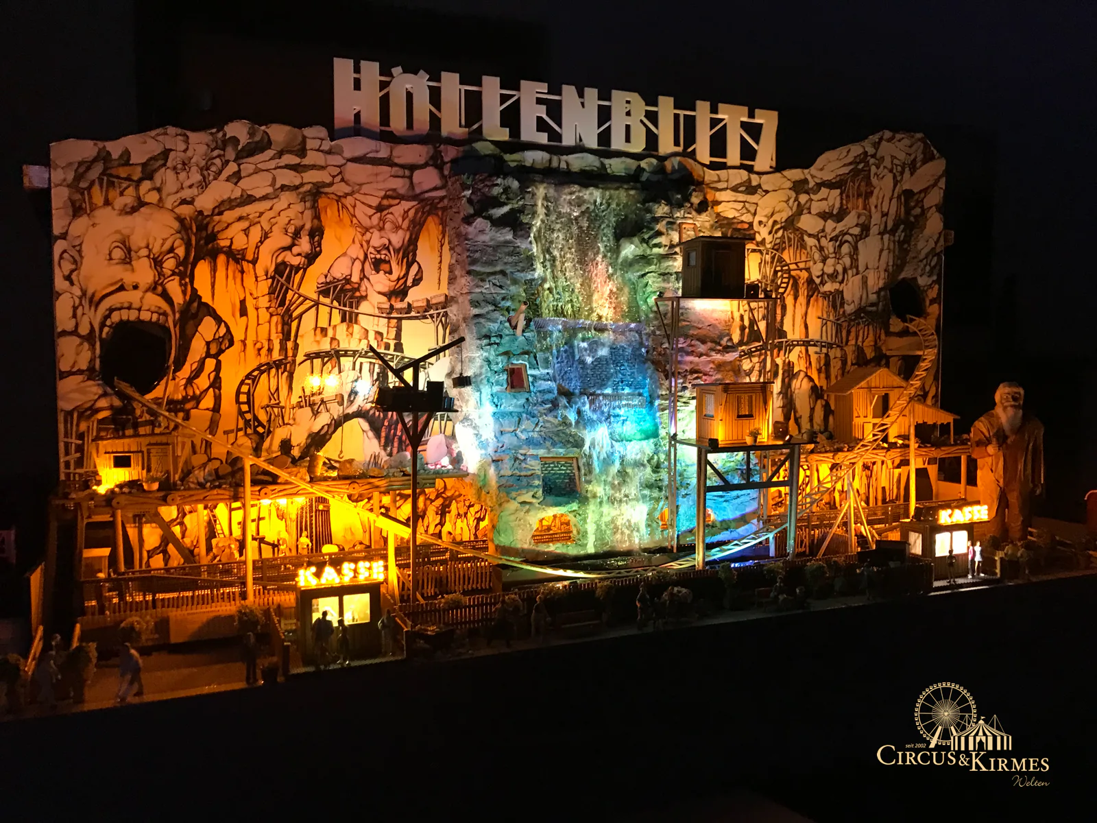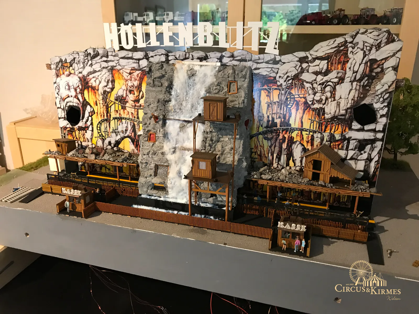 Nach zahlreichen Arbeitsstunden entstand dieses detailgetreue Modell des bekannten Fahrgeschäfts Höllenblitz im Maßstab 1:87. Es handelt sich um einen kompletten Eigenbau – von der Grundkonstruktion über die Antriebs- und Beleuchtungstechnik bis hin zur aufwendigen Gestaltung der Fassade und Szenerie.