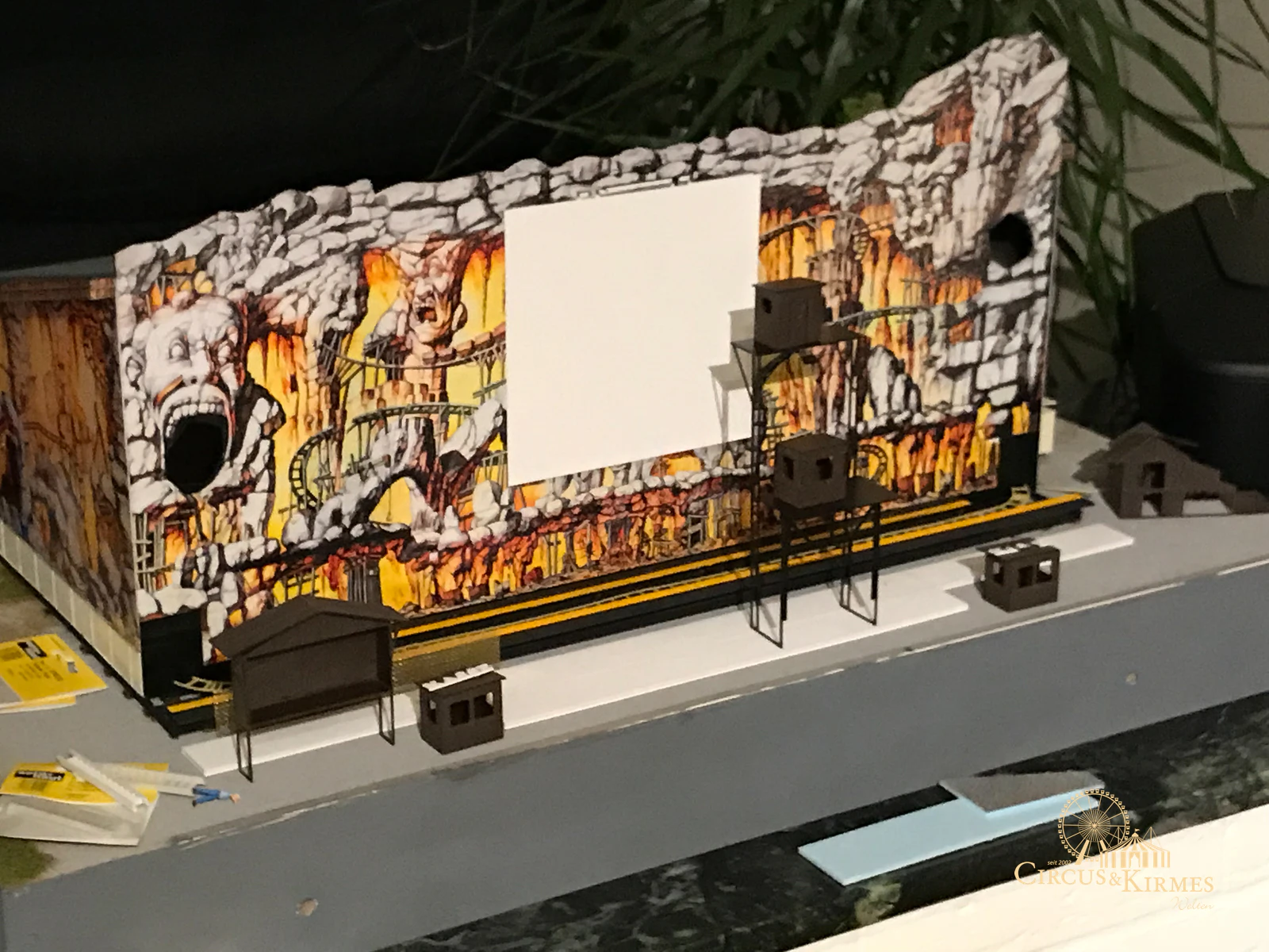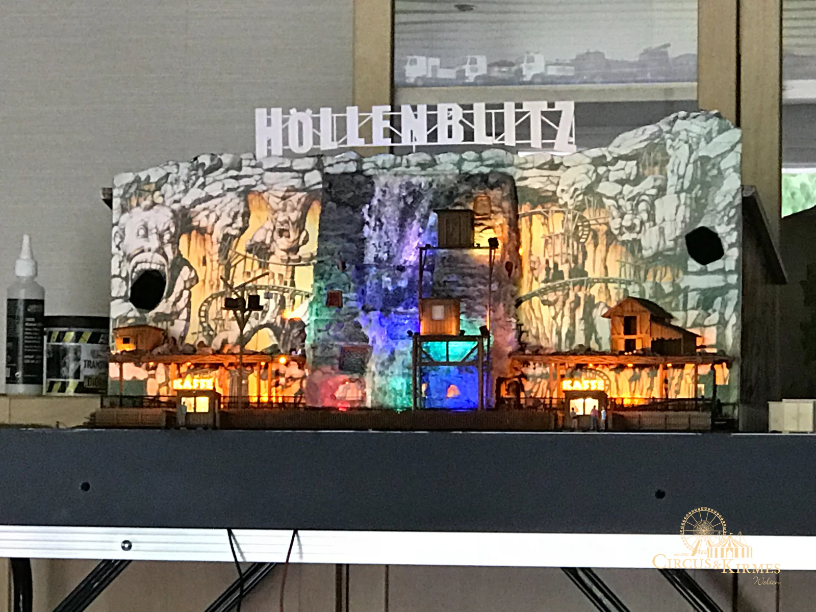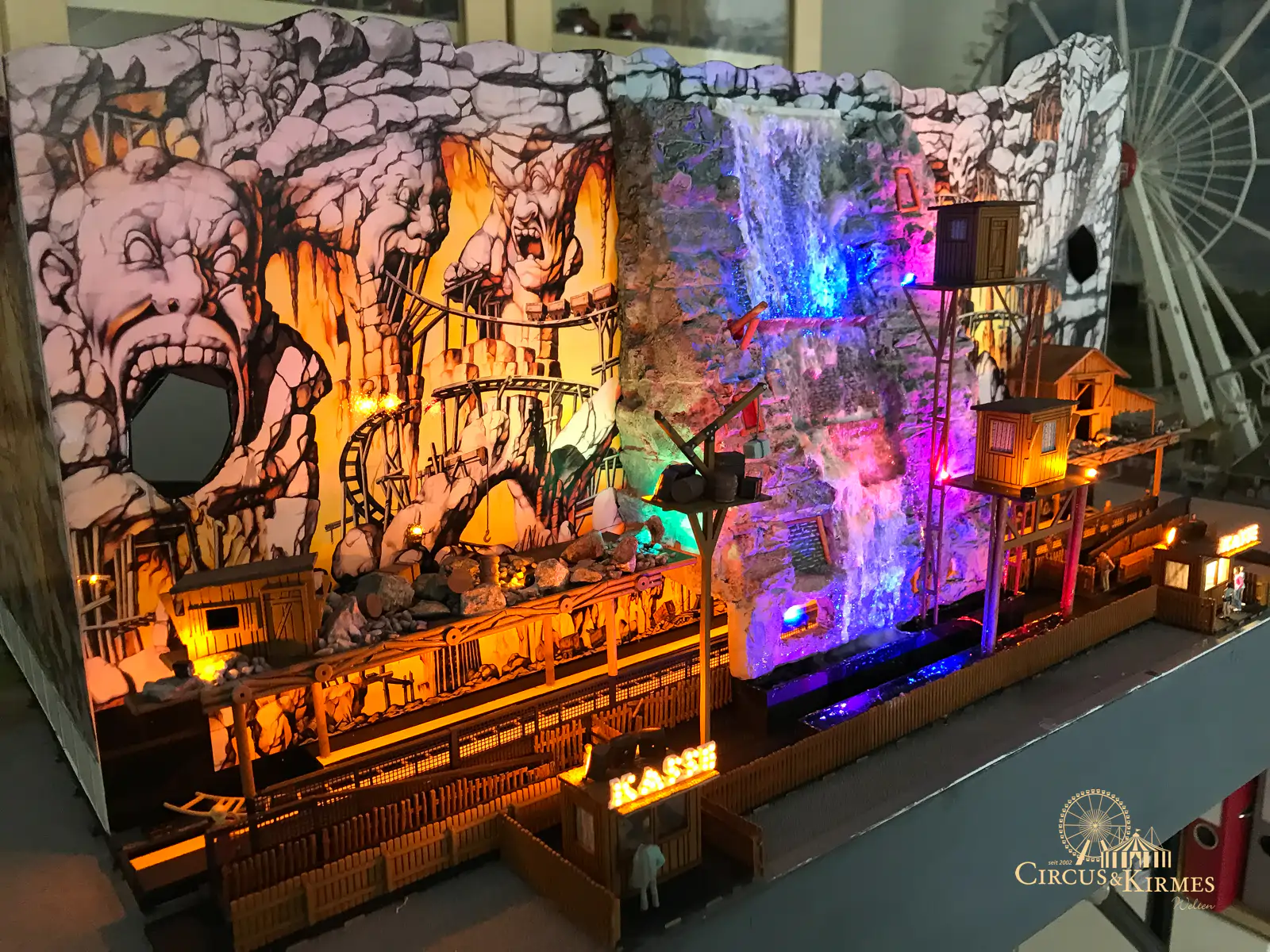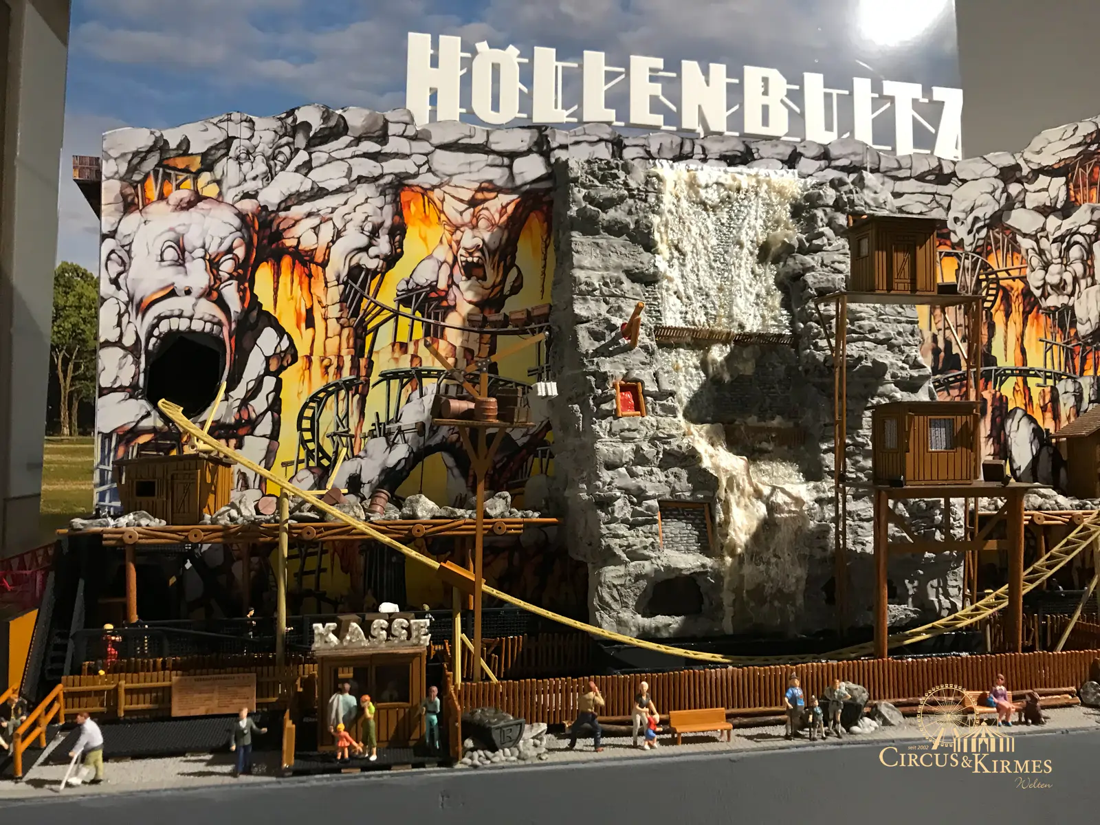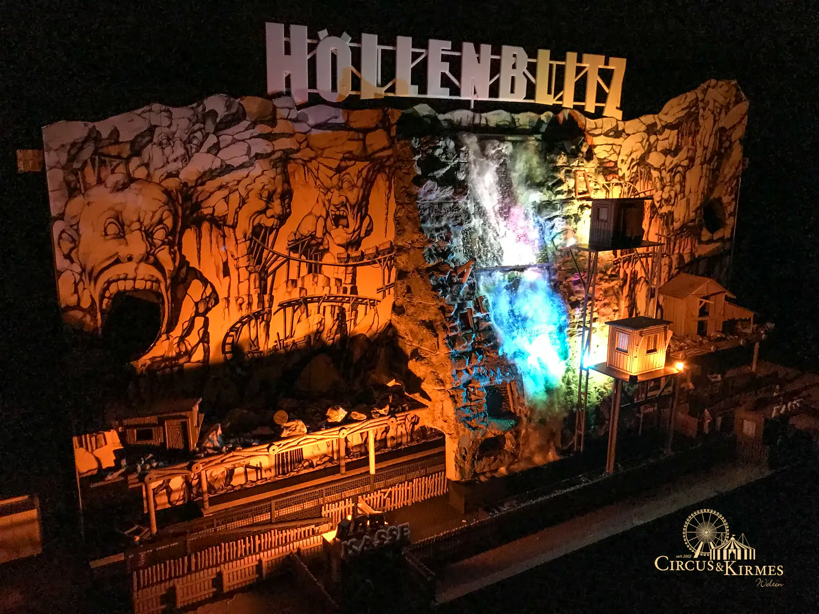 Nach zahlreichen Arbeitsstunden entstand dieses detailgetreue Modell des bekannten Fahrgeschäfts Höllenblitz im Maßstab 1:87. Es handelt sich um einen kompletten Eigenbau – von der Grundkonstruktion über die Antriebs- und Beleuchtungstechnik bis hin zur aufwendigen Gestaltung der Fassade und Szenerie.