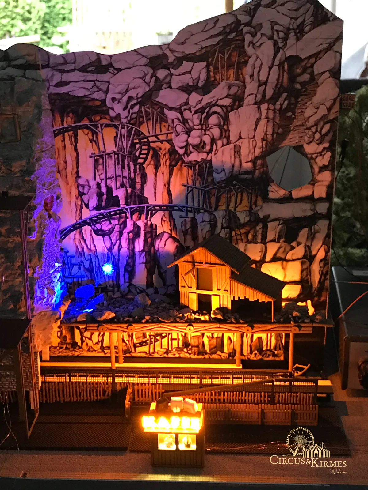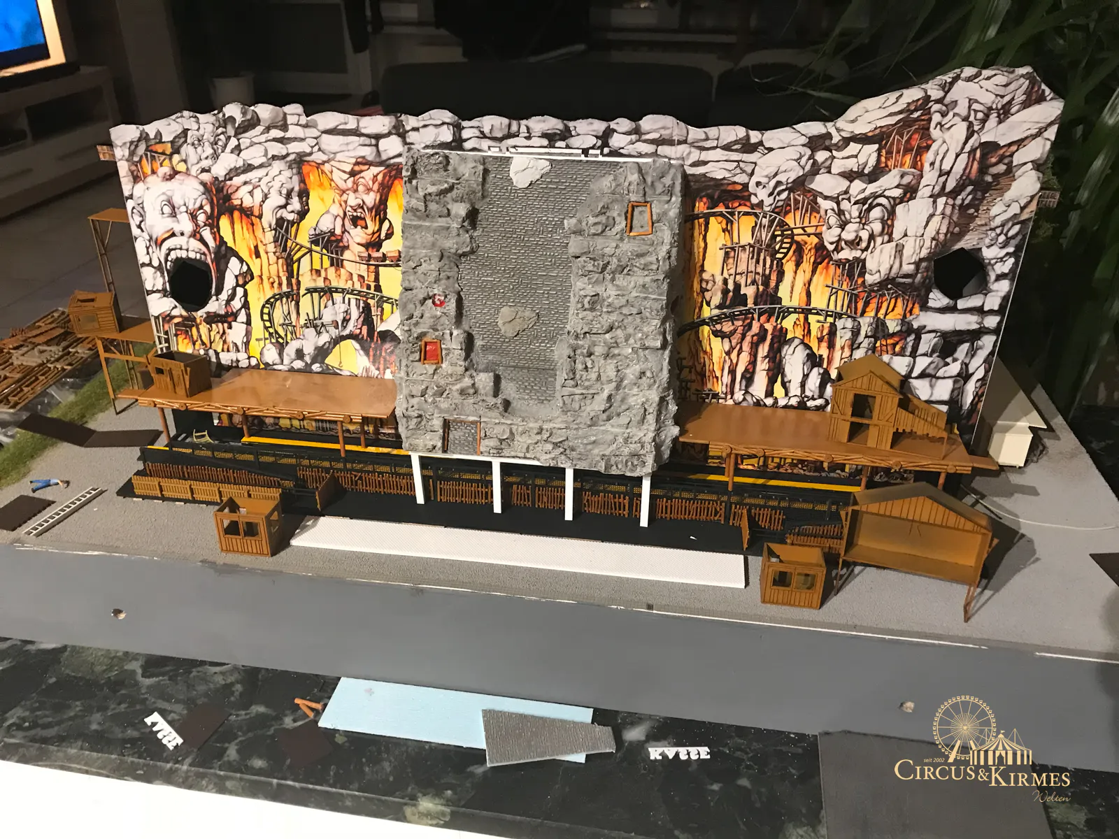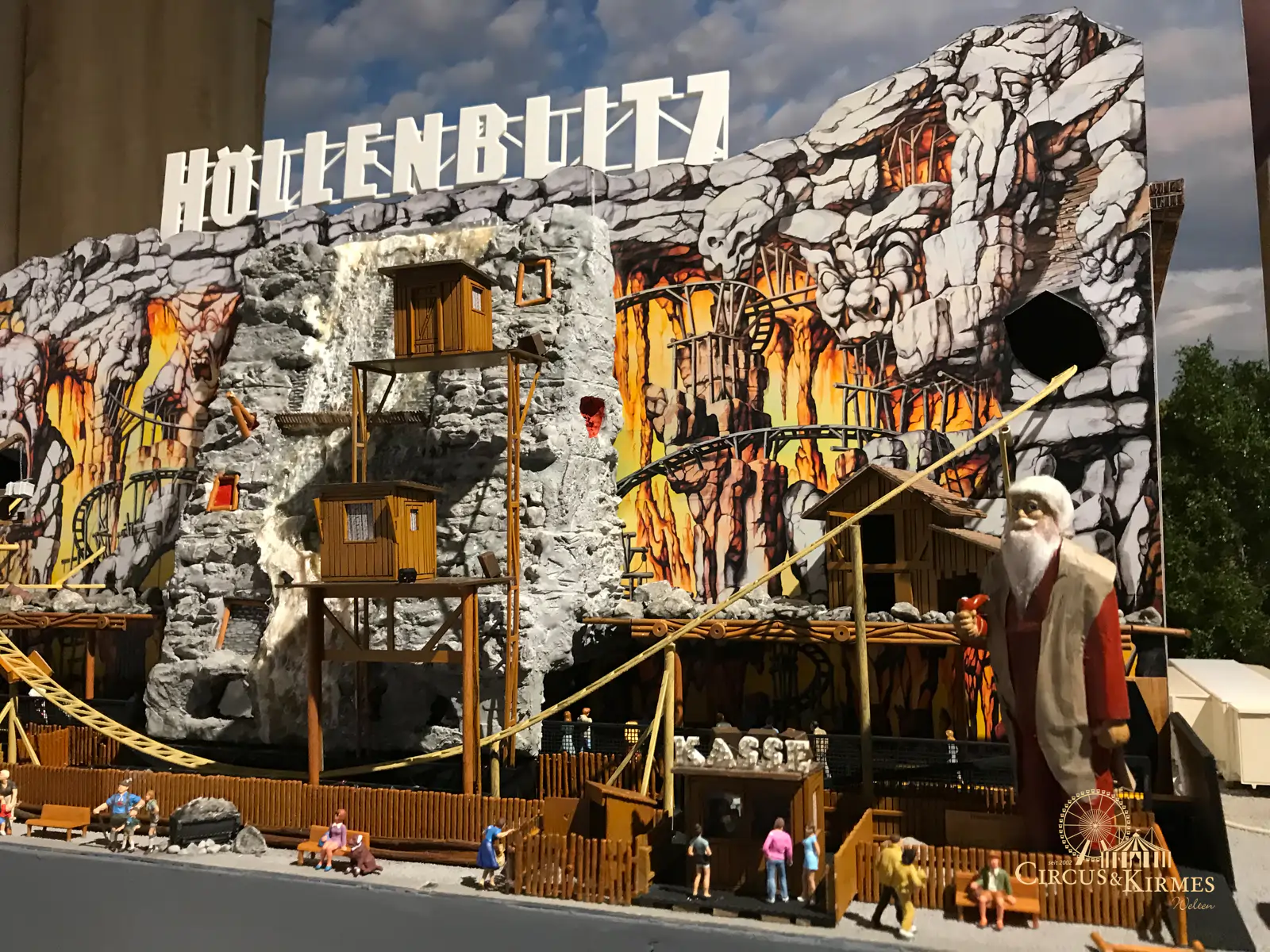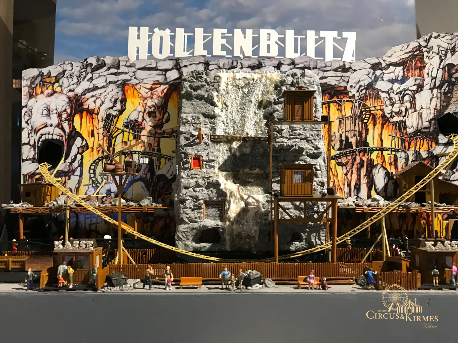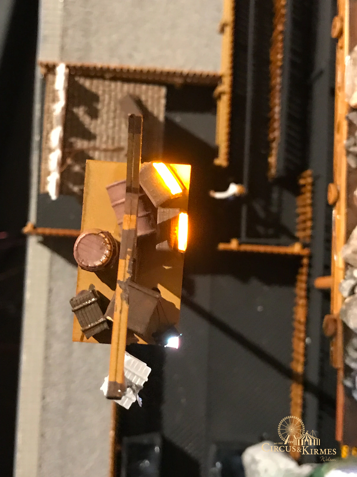 Nach zahlreichen Arbeitsstunden entstand dieses detailgetreue Modell des bekannten Fahrgeschäfts Höllenblitz im Maßstab 1:87. Es handelt sich um einen kompletten Eigenbau – von der Grundkonstruktion über die Antriebs- und Beleuchtungstechnik bis hin zur aufwendigen Gestaltung der Fassade und Szenerie.