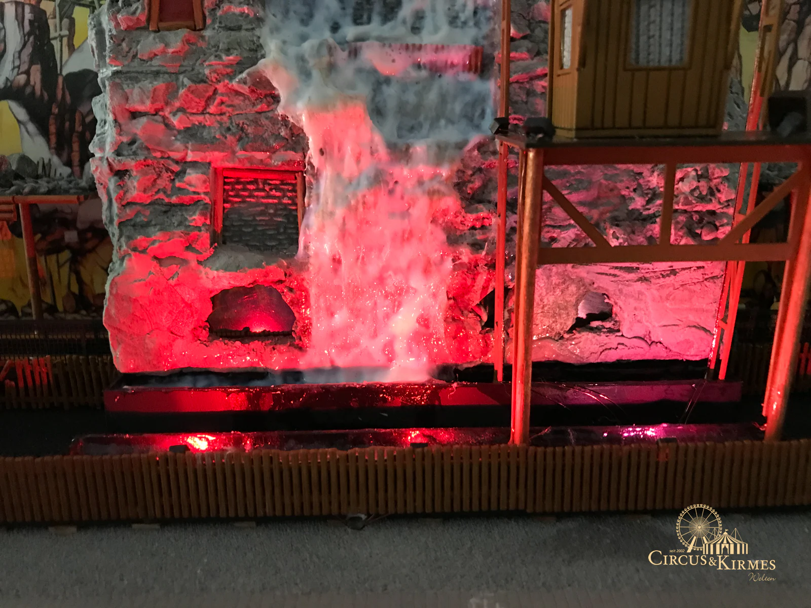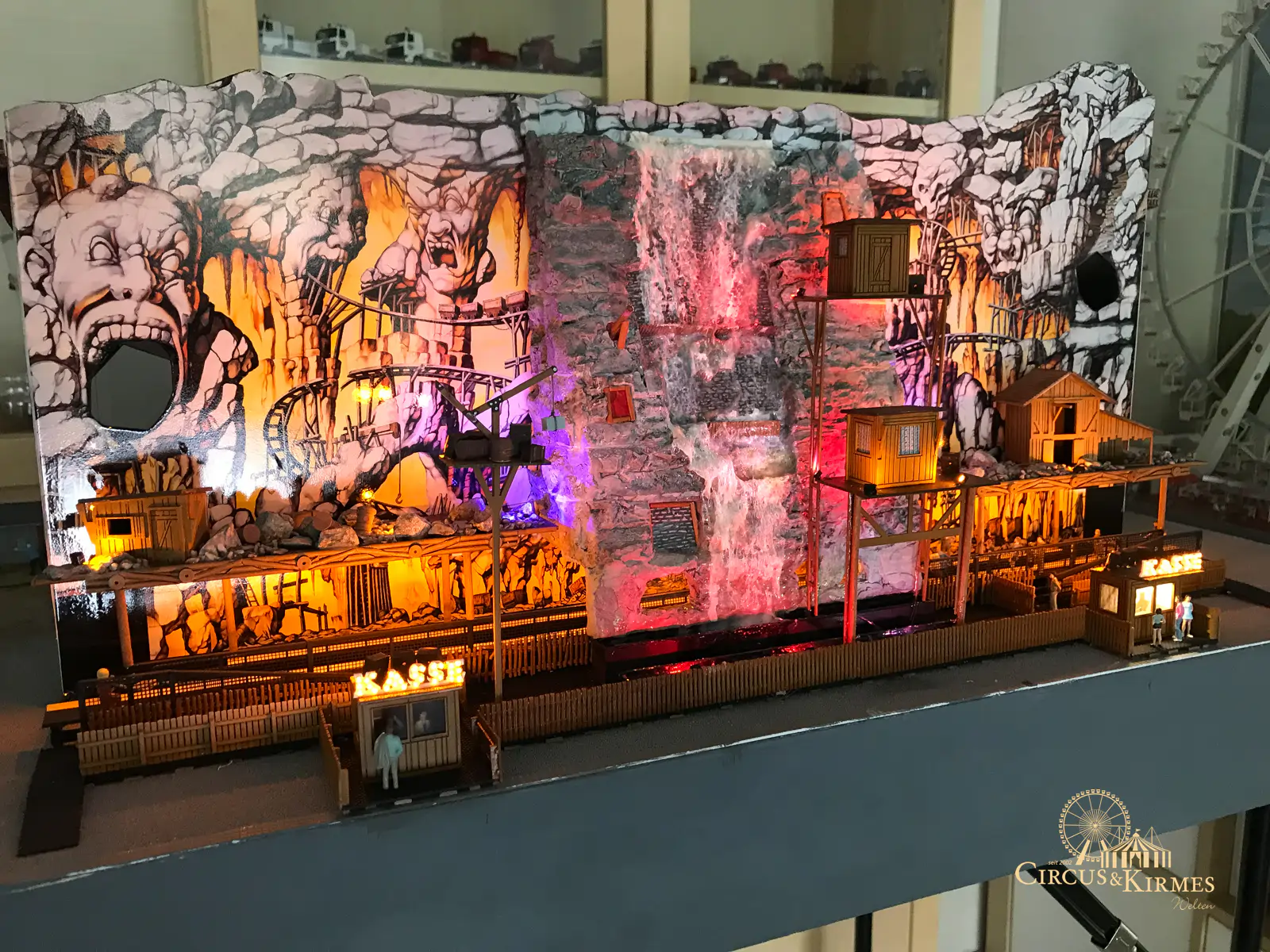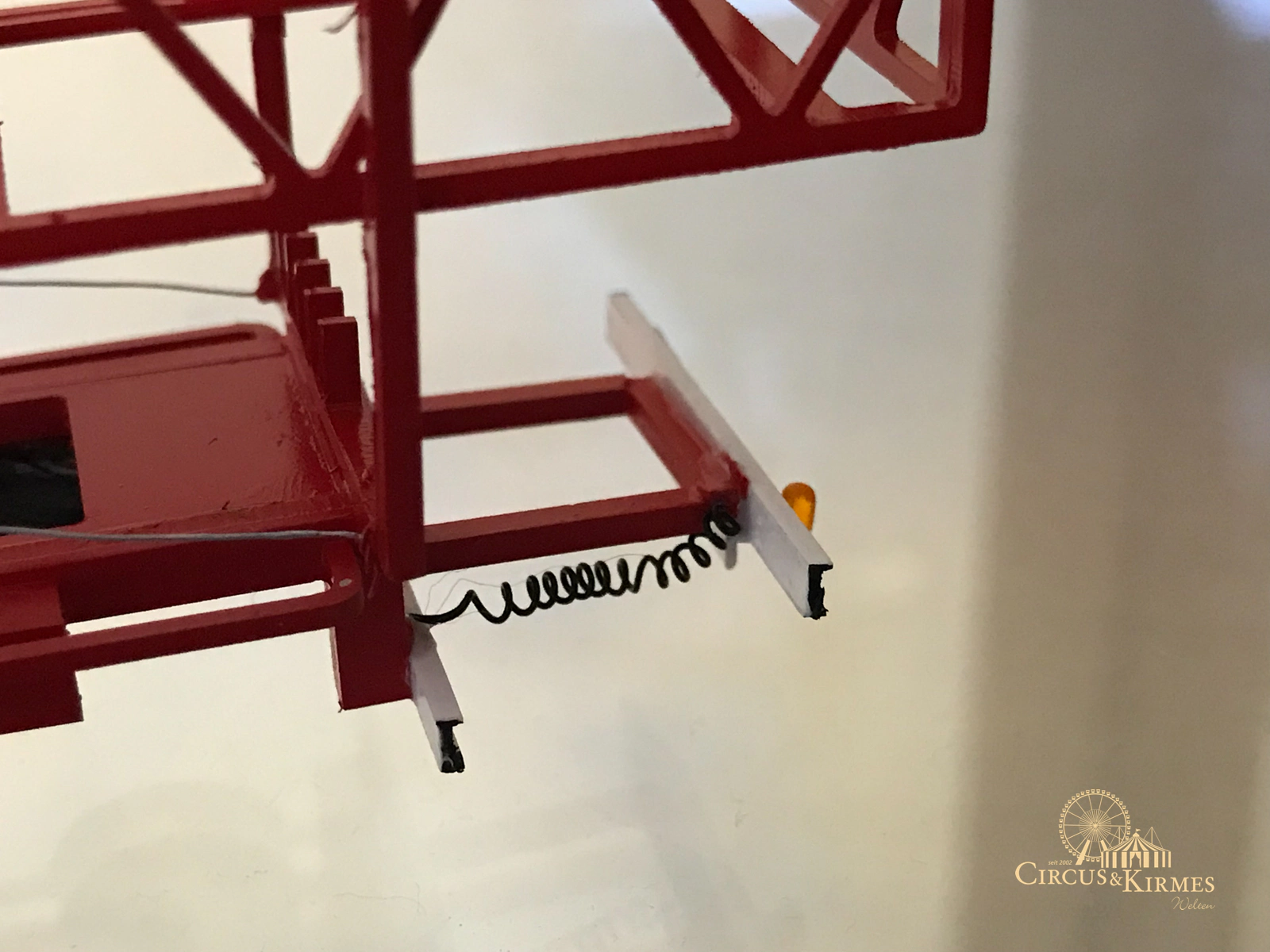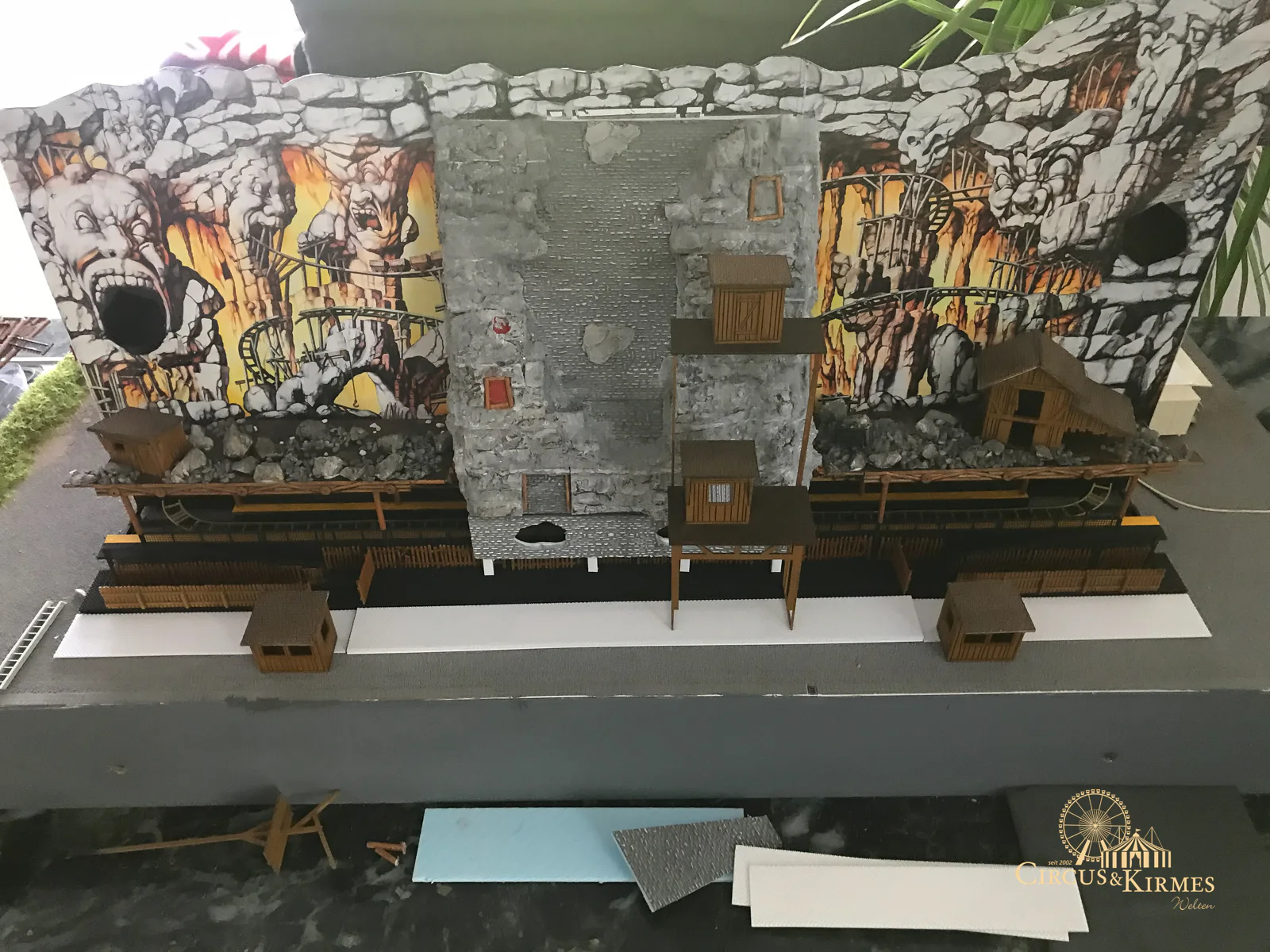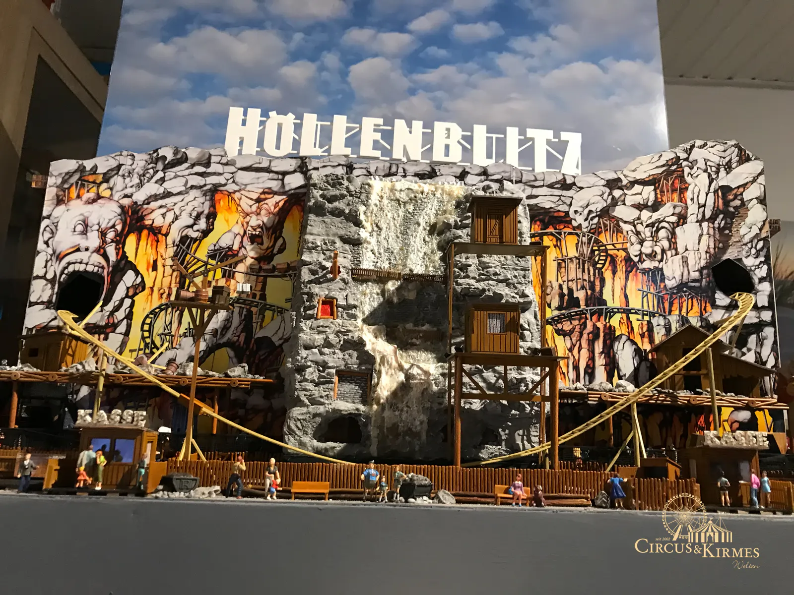 Nach zahlreichen Arbeitsstunden entstand dieses detailgetreue Modell des bekannten Fahrgeschäfts Höllenblitz im Maßstab 1:87. Es handelt sich um einen kompletten Eigenbau – von der Grundkonstruktion über die Antriebs- und Beleuchtungstechnik bis hin zur aufwendigen Gestaltung der Fassade und Szenerie.