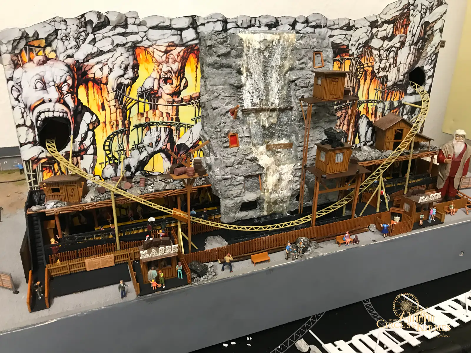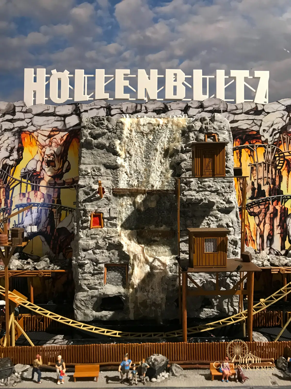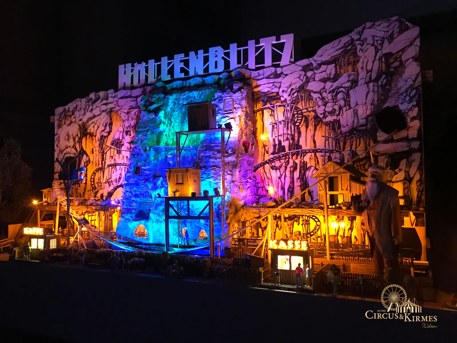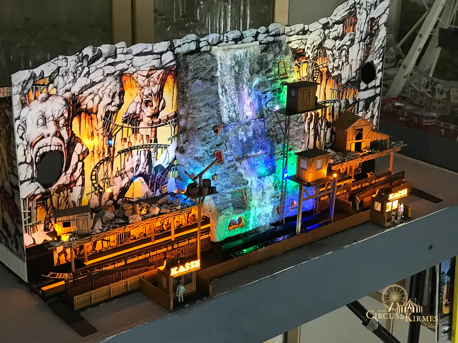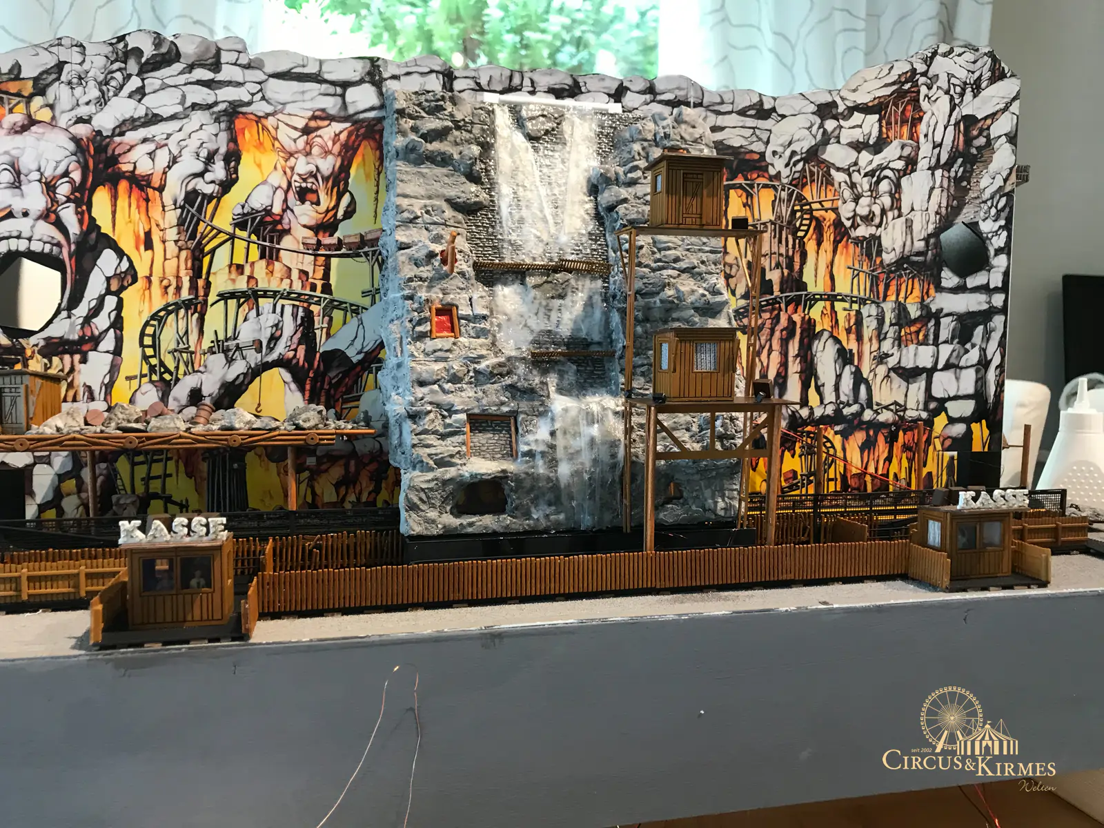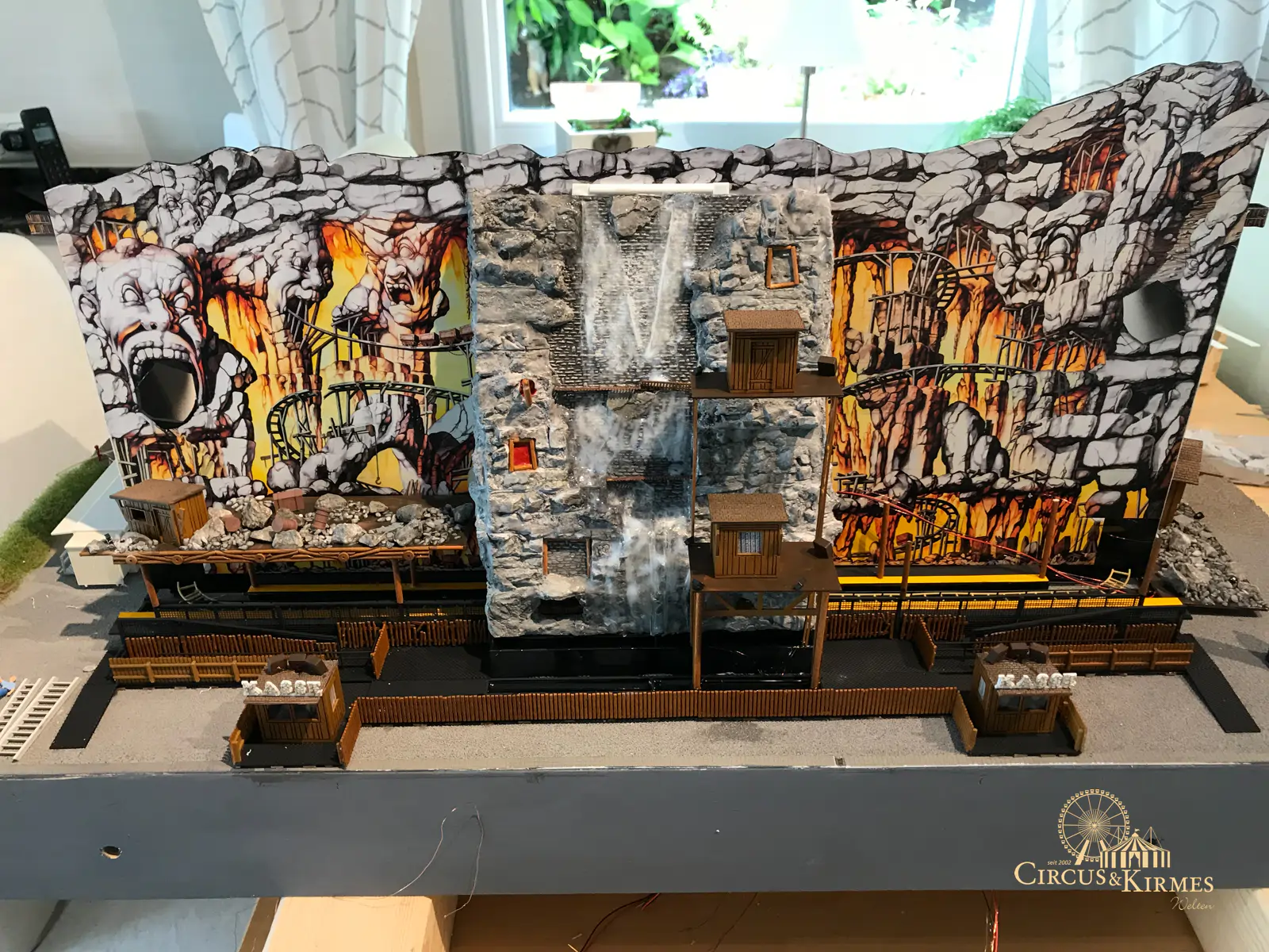 Nach zahlreichen Arbeitsstunden entstand dieses detailgetreue Modell des bekannten Fahrgeschäfts Höllenblitz im Maßstab 1:87. Es handelt sich um einen kompletten Eigenbau – von der Grundkonstruktion über die Antriebs- und Beleuchtungstechnik bis hin zur aufwendigen Gestaltung der Fassade und Szenerie.