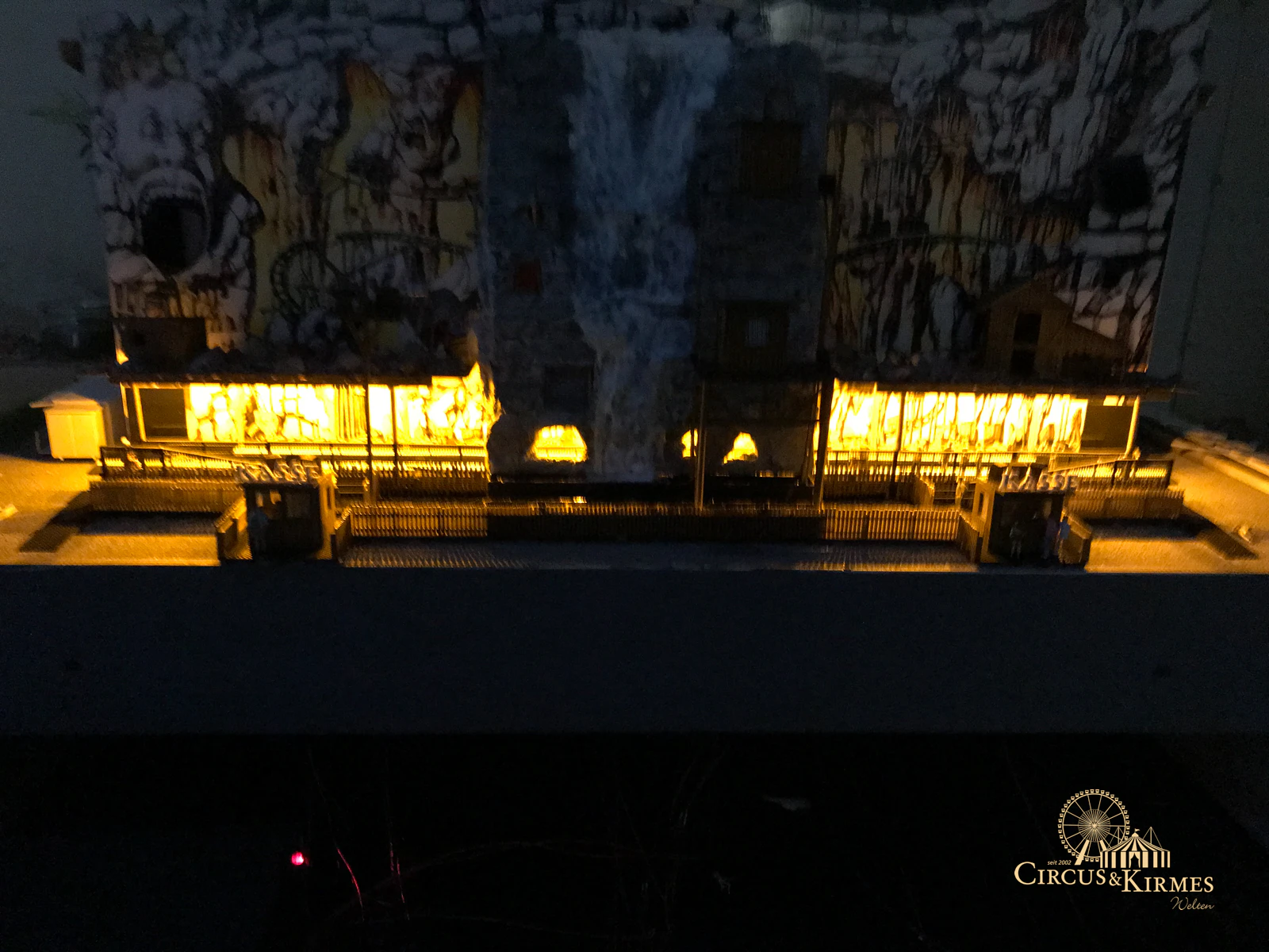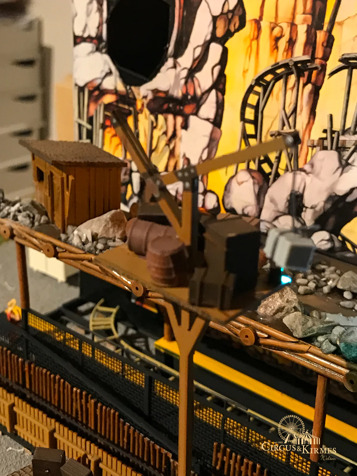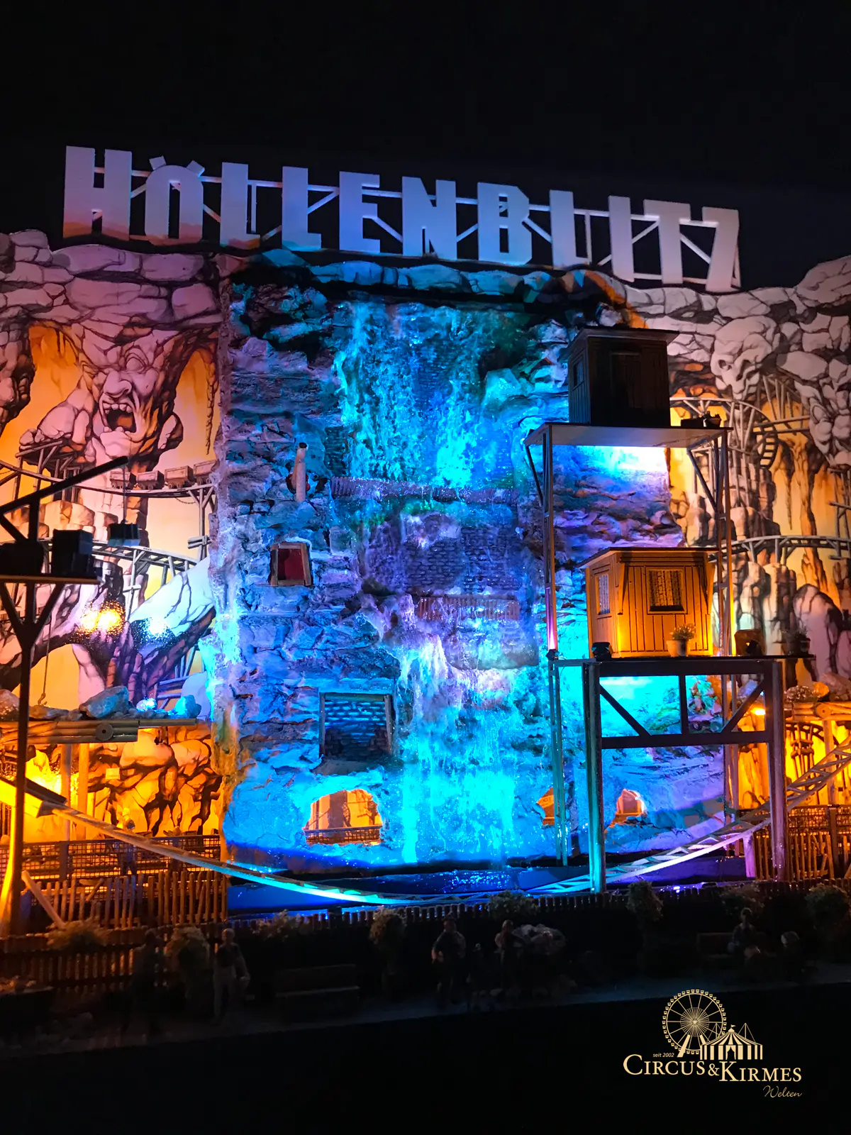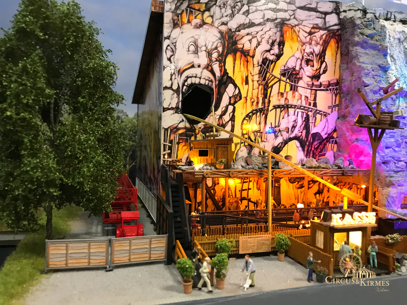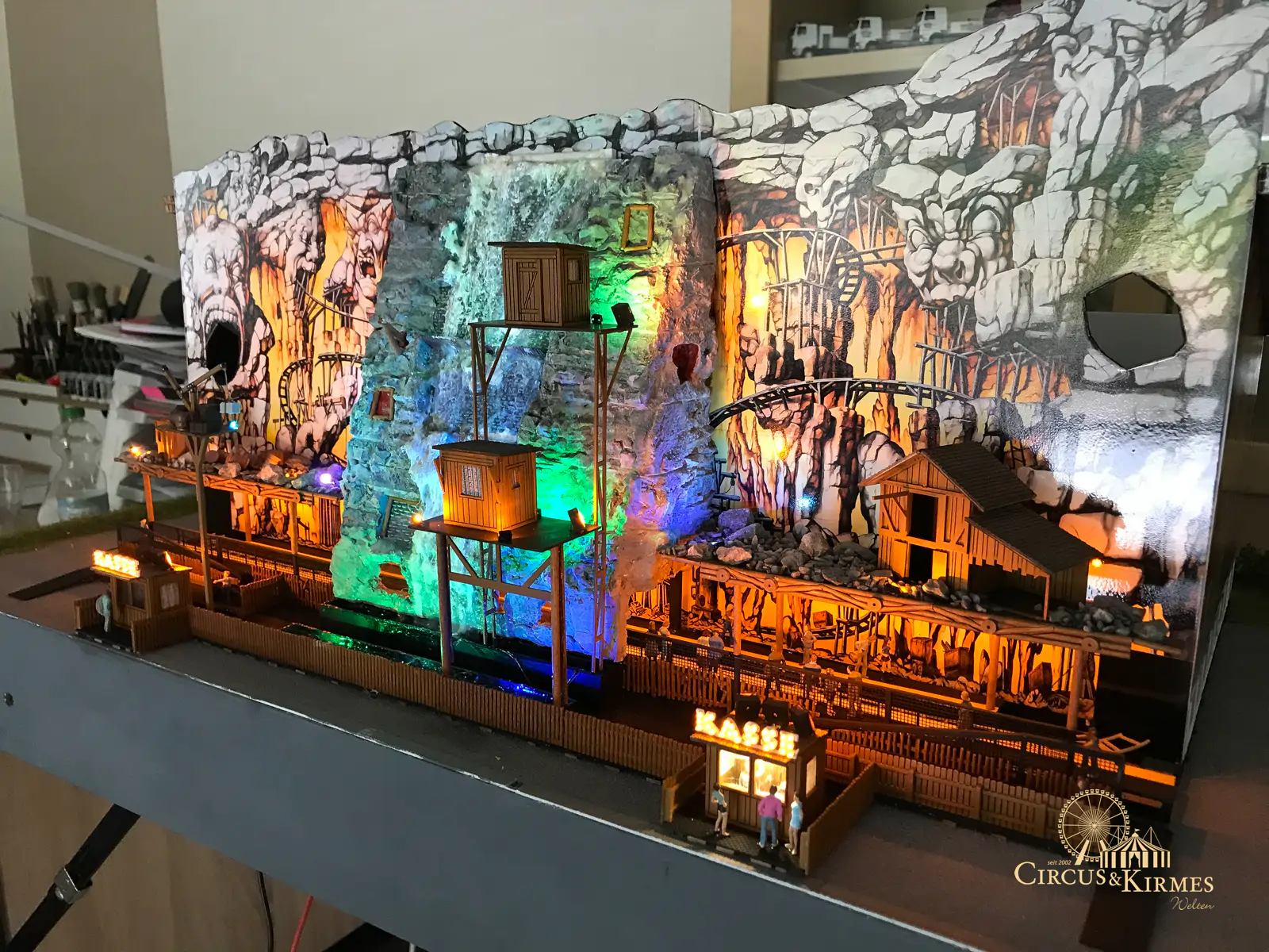 Nach zahlreichen Arbeitsstunden entstand dieses detailgetreue Modell des bekannten Fahrgeschäfts Höllenblitz im Maßstab 1:87. Es handelt sich um einen kompletten Eigenbau – von der Grundkonstruktion über die Antriebs- und Beleuchtungstechnik bis hin zur aufwendigen Gestaltung der Fassade und Szenerie.