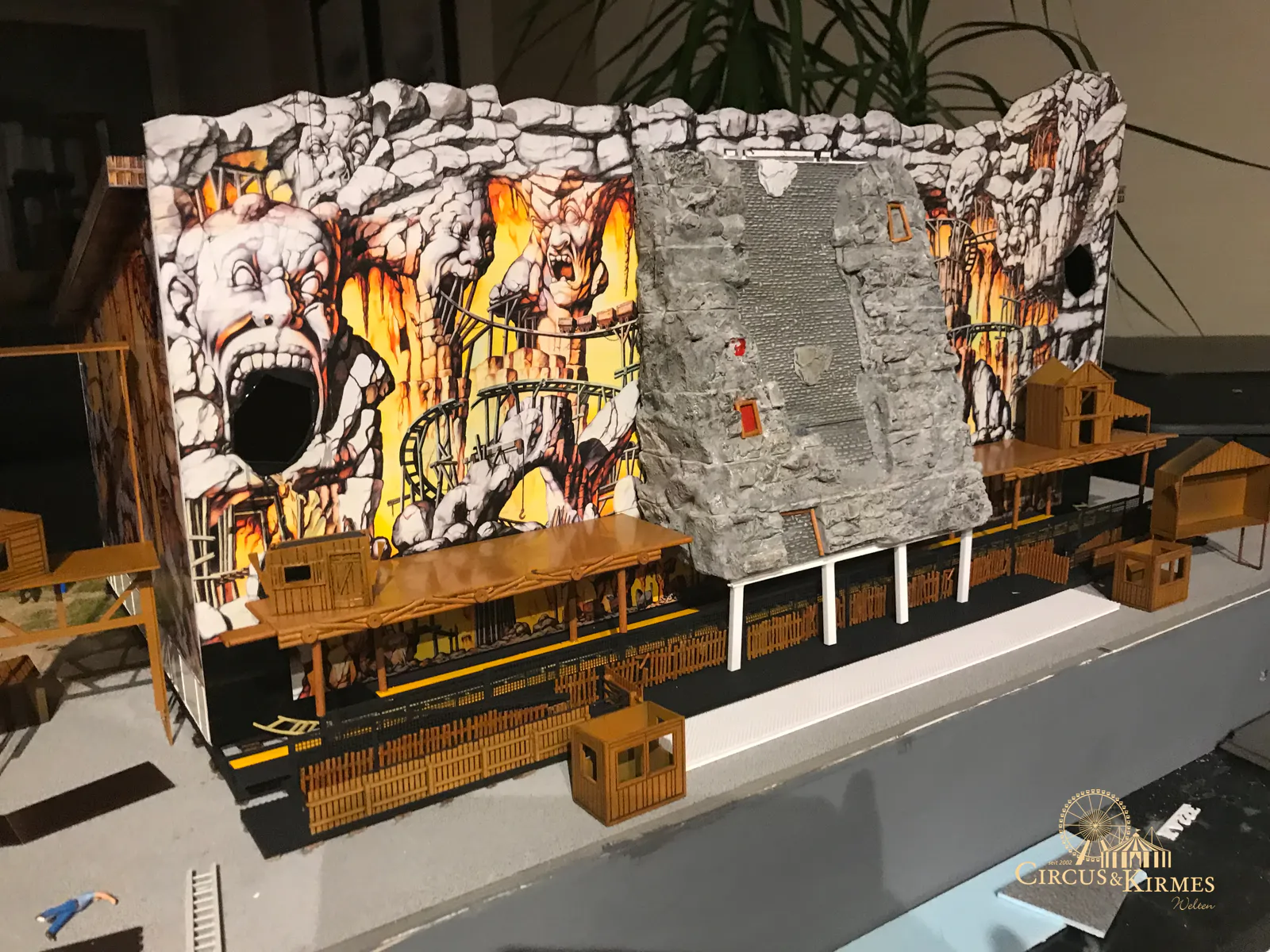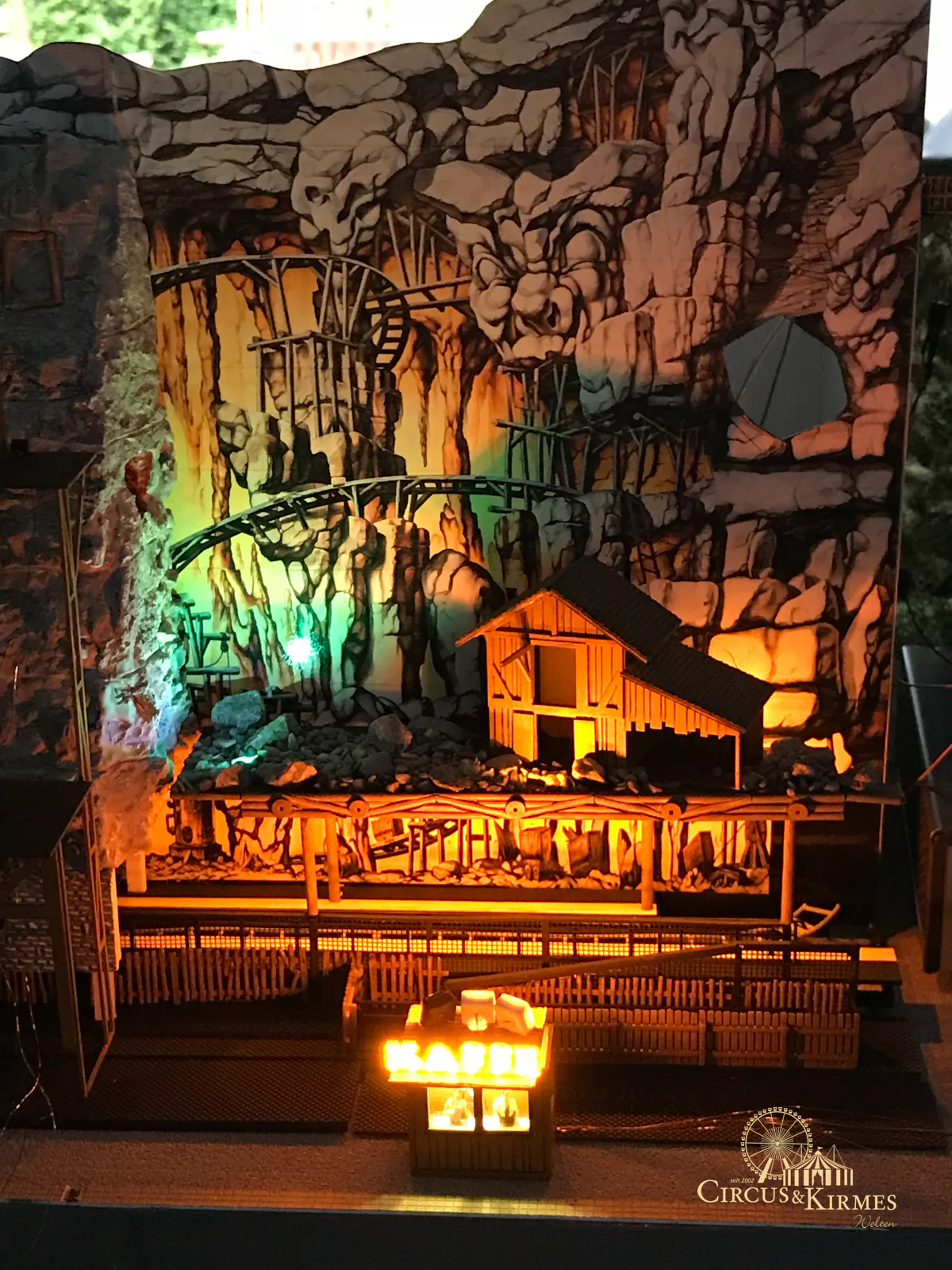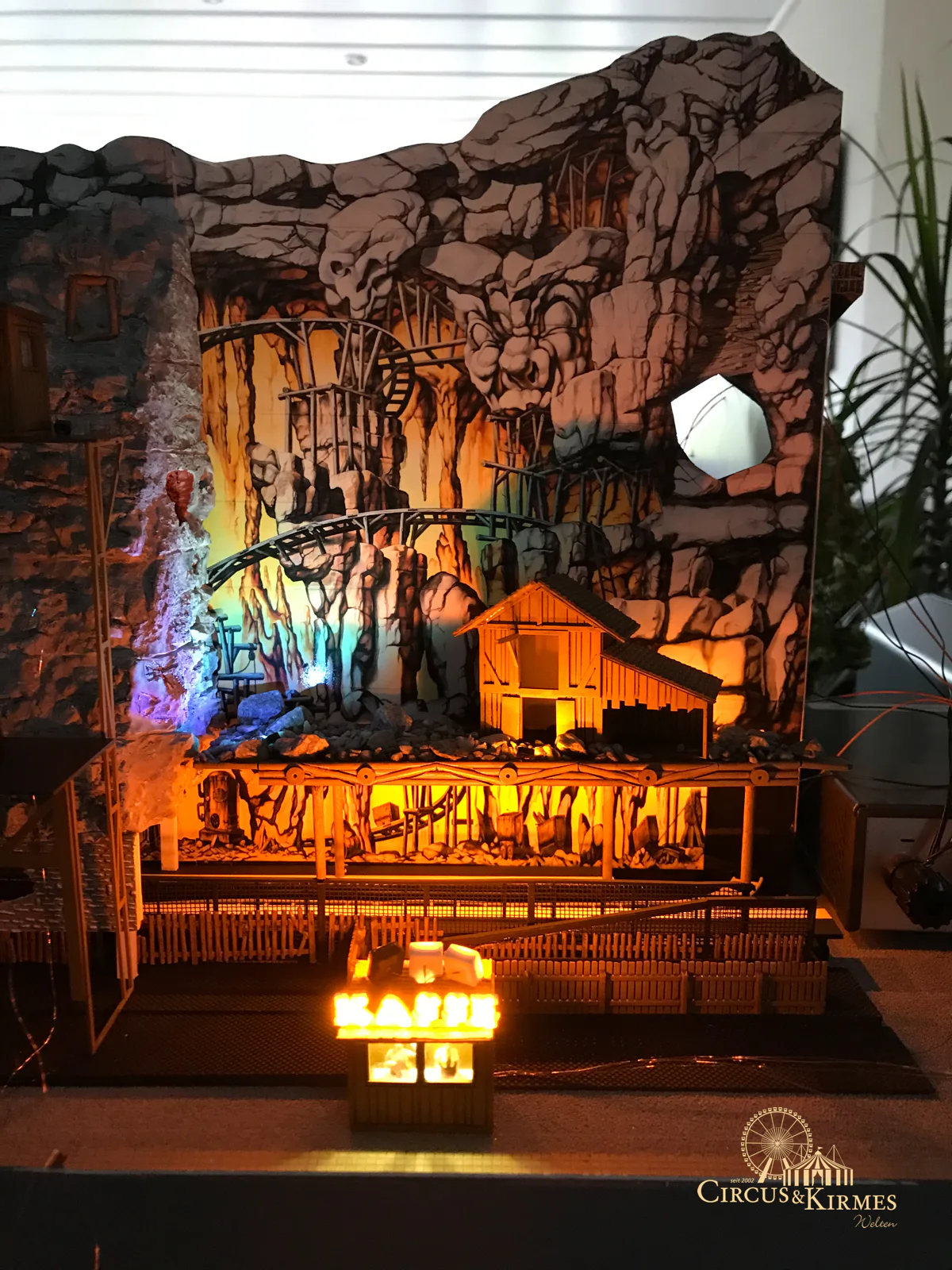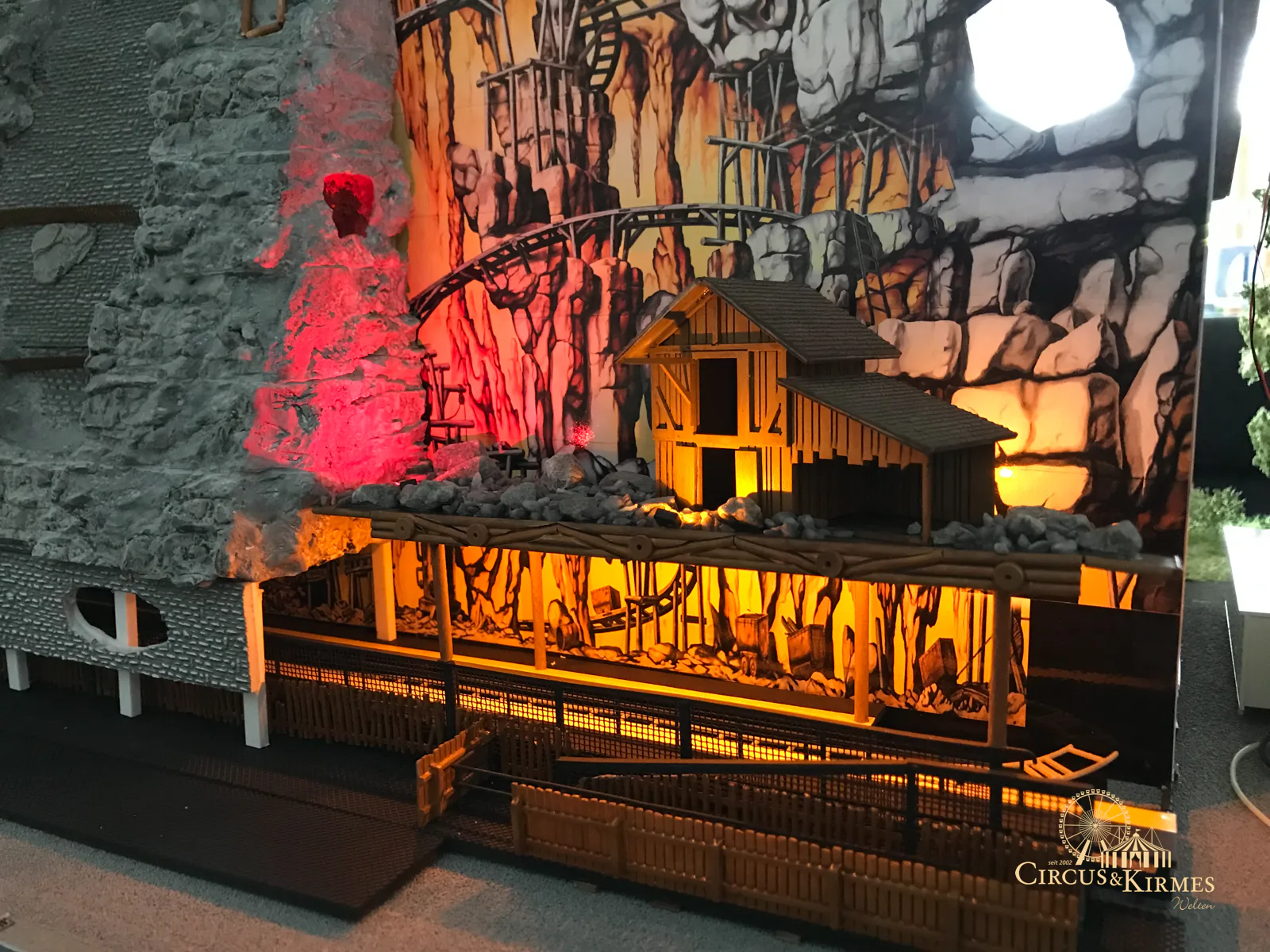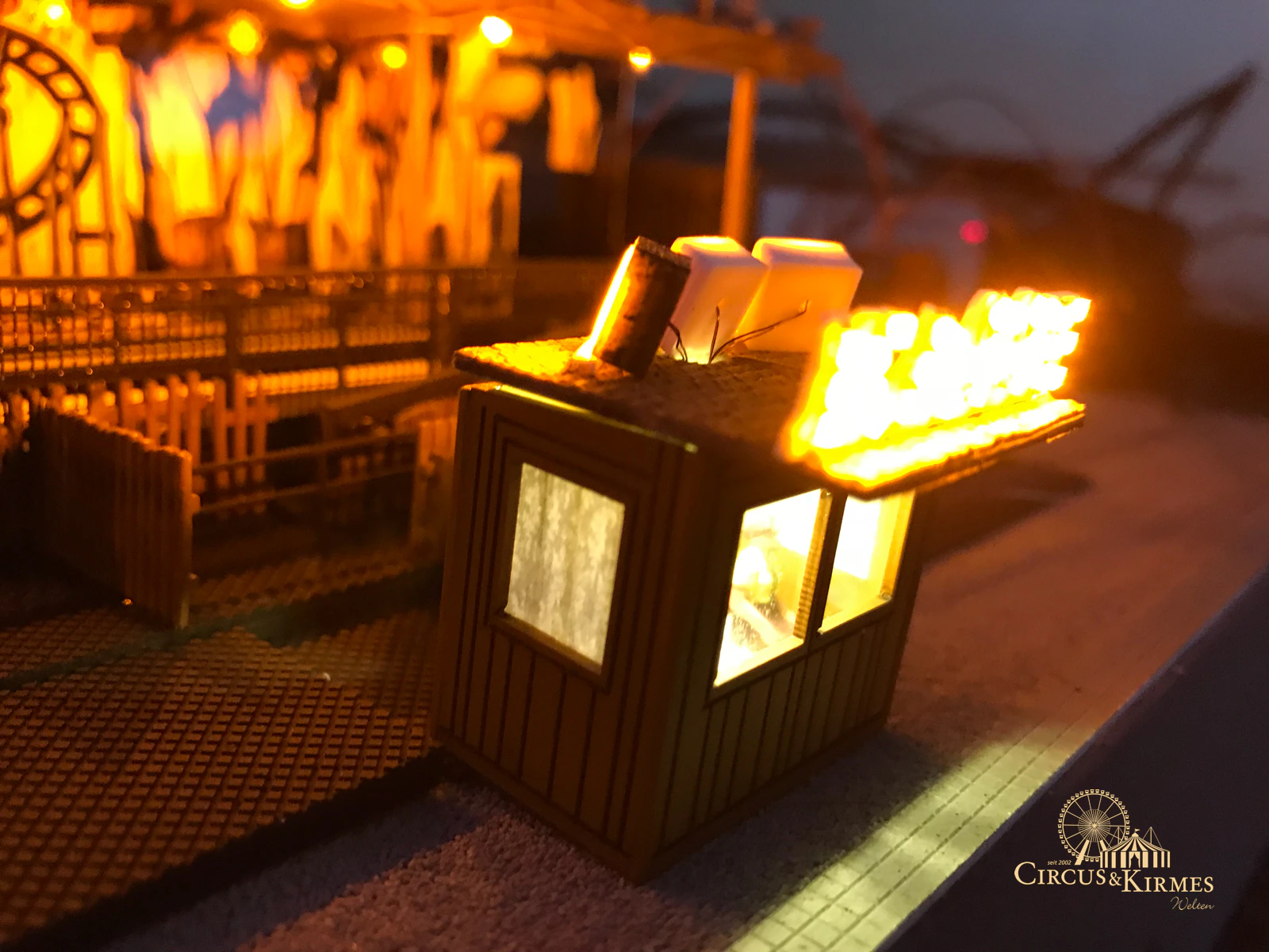 Nach zahlreichen Arbeitsstunden entstand dieses detailgetreue Modell des bekannten Fahrgeschäfts Höllenblitz im Maßstab 1:87. Es handelt sich um einen kompletten Eigenbau – von der Grundkonstruktion über die Antriebs- und Beleuchtungstechnik bis hin zur aufwendigen Gestaltung der Fassade und Szenerie.