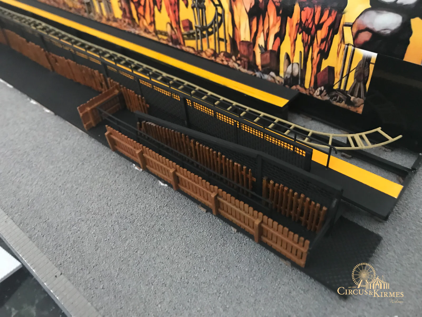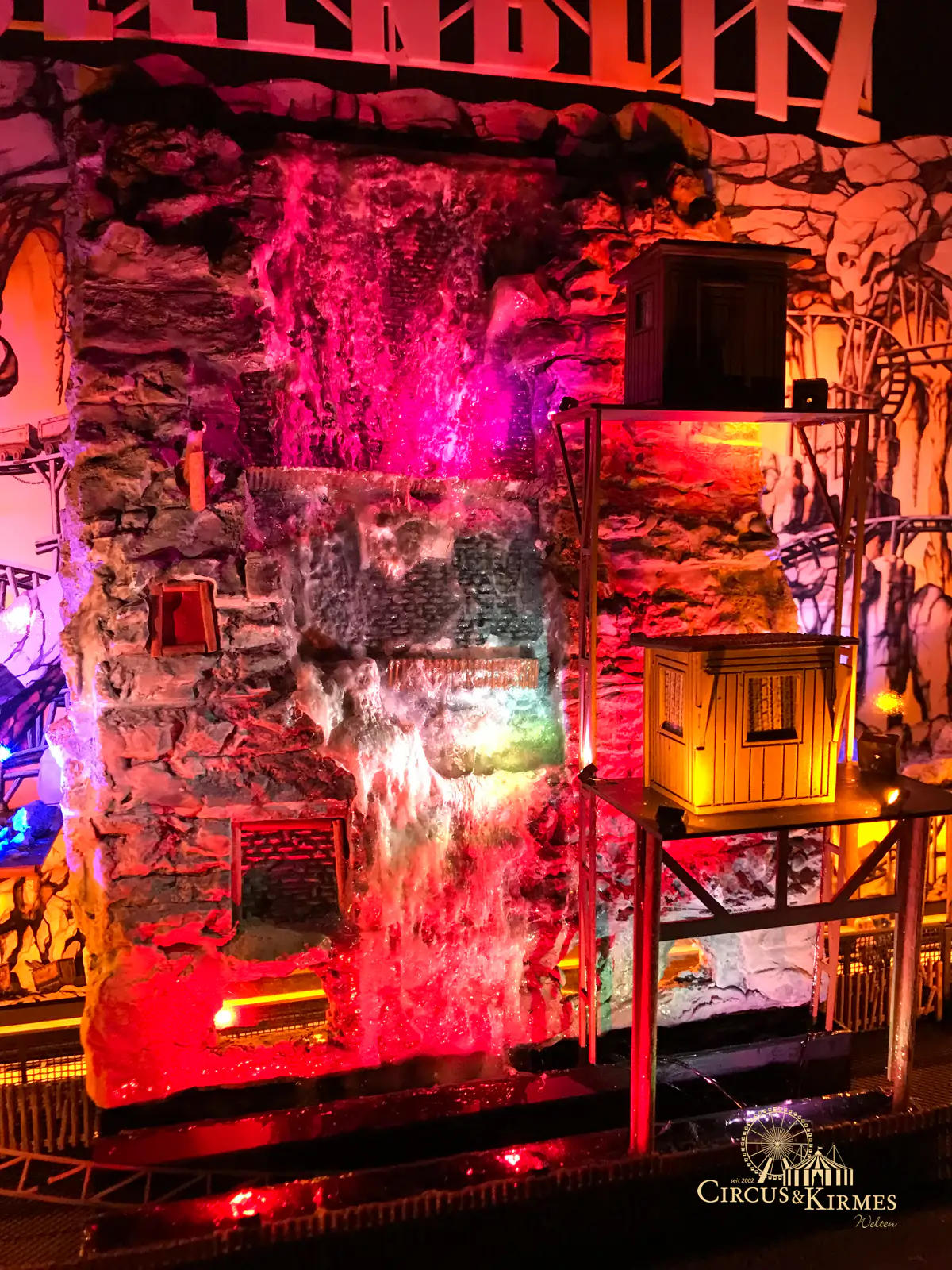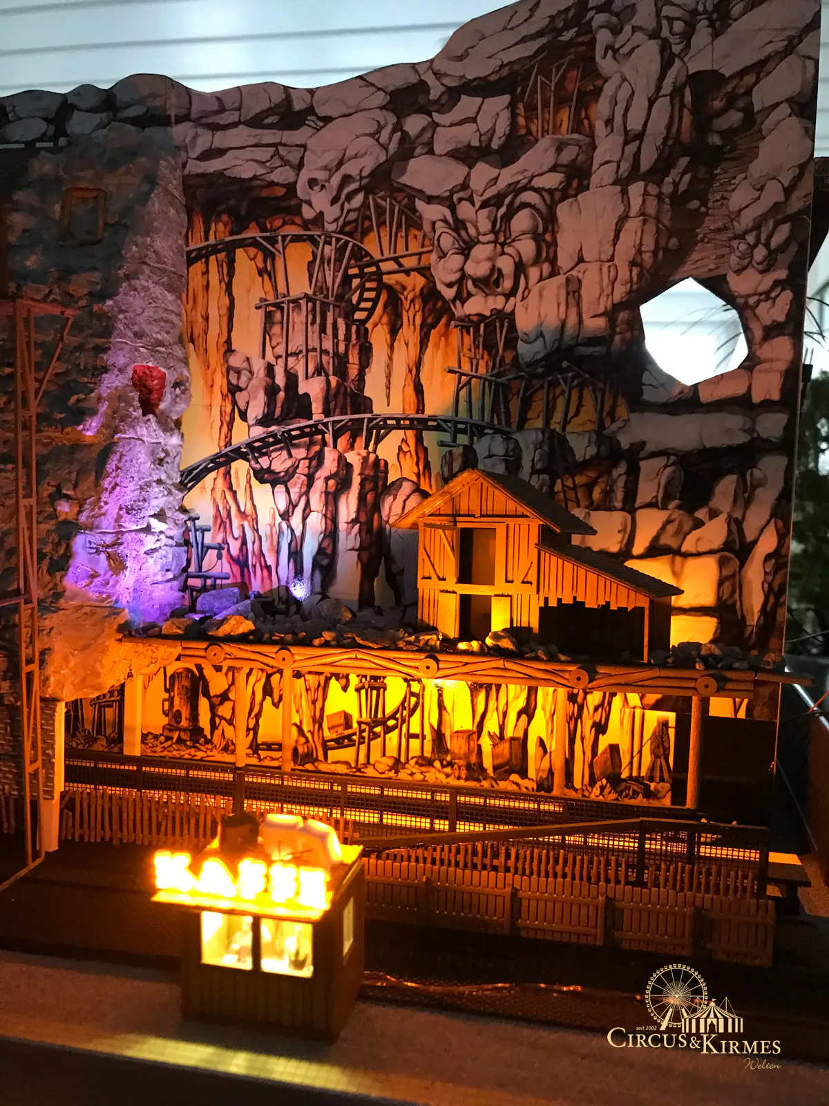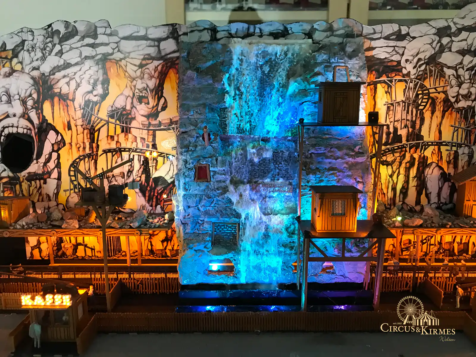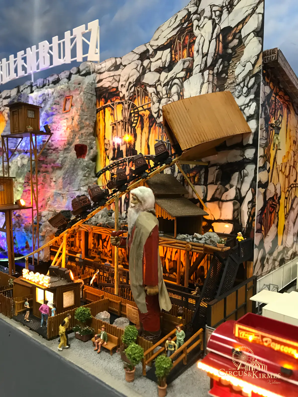 Nach zahlreichen Arbeitsstunden entstand dieses detailgetreue Modell des bekannten Fahrgeschäfts Höllenblitz im Maßstab 1:87. Es handelt sich um einen kompletten Eigenbau – von der Grundkonstruktion über die Antriebs- und Beleuchtungstechnik bis hin zur aufwendigen Gestaltung der Fassade und Szenerie.