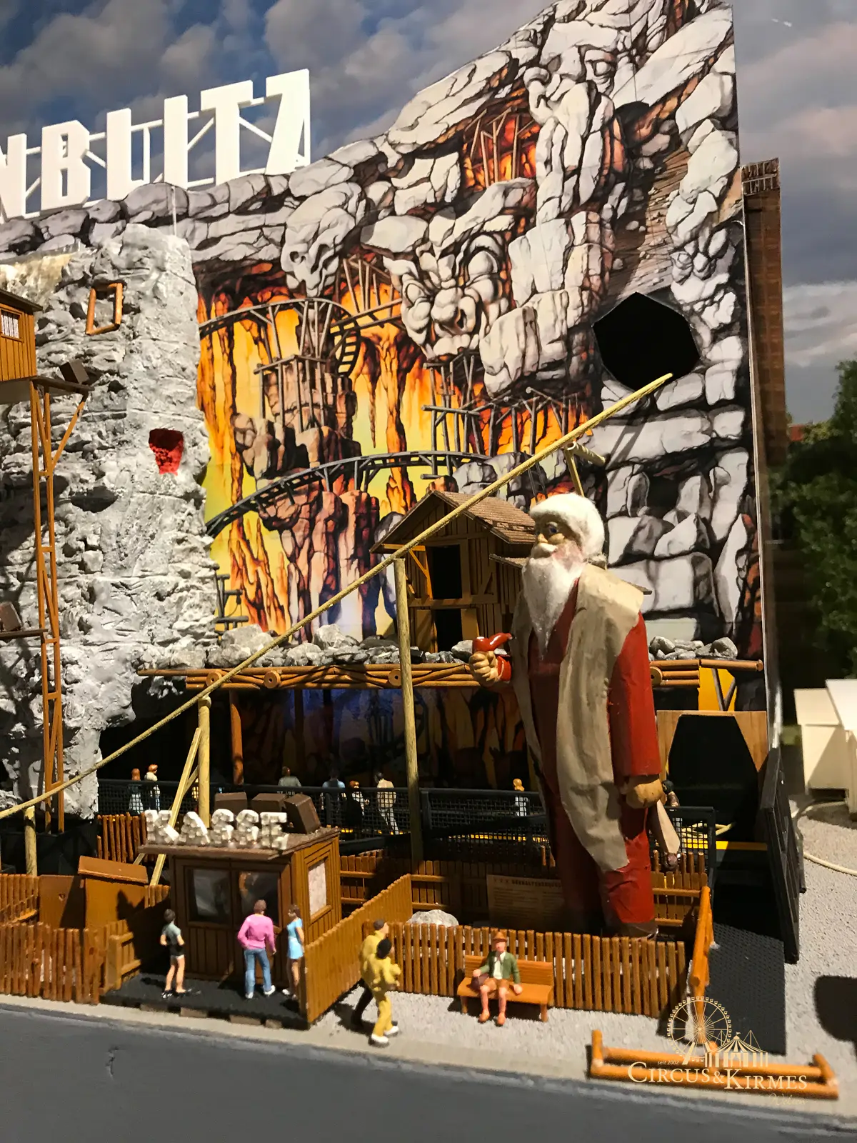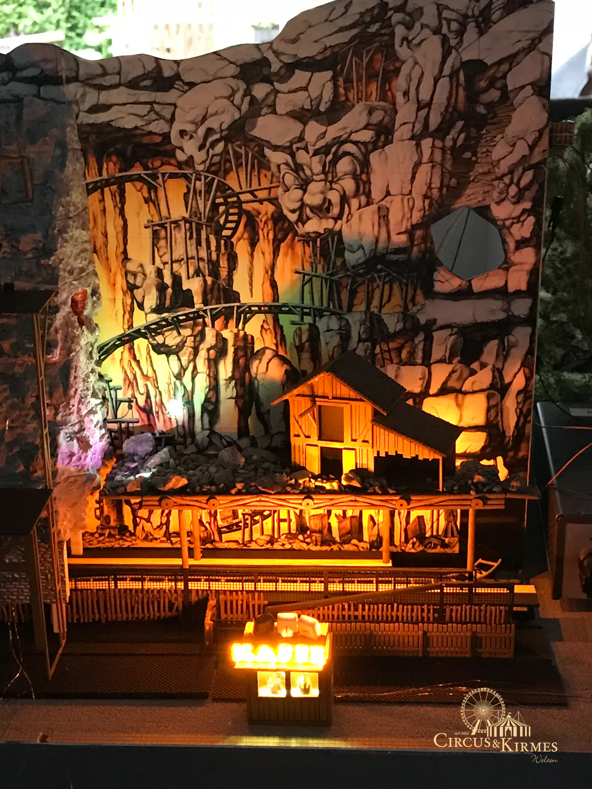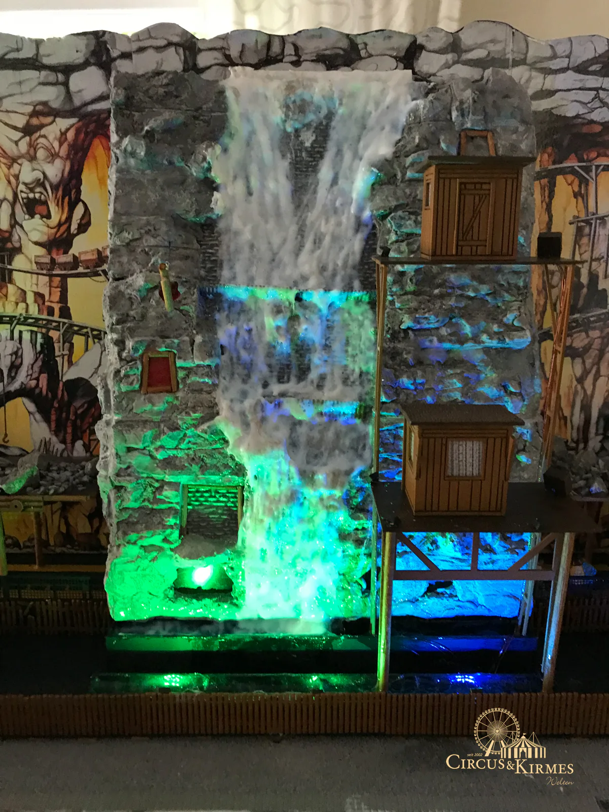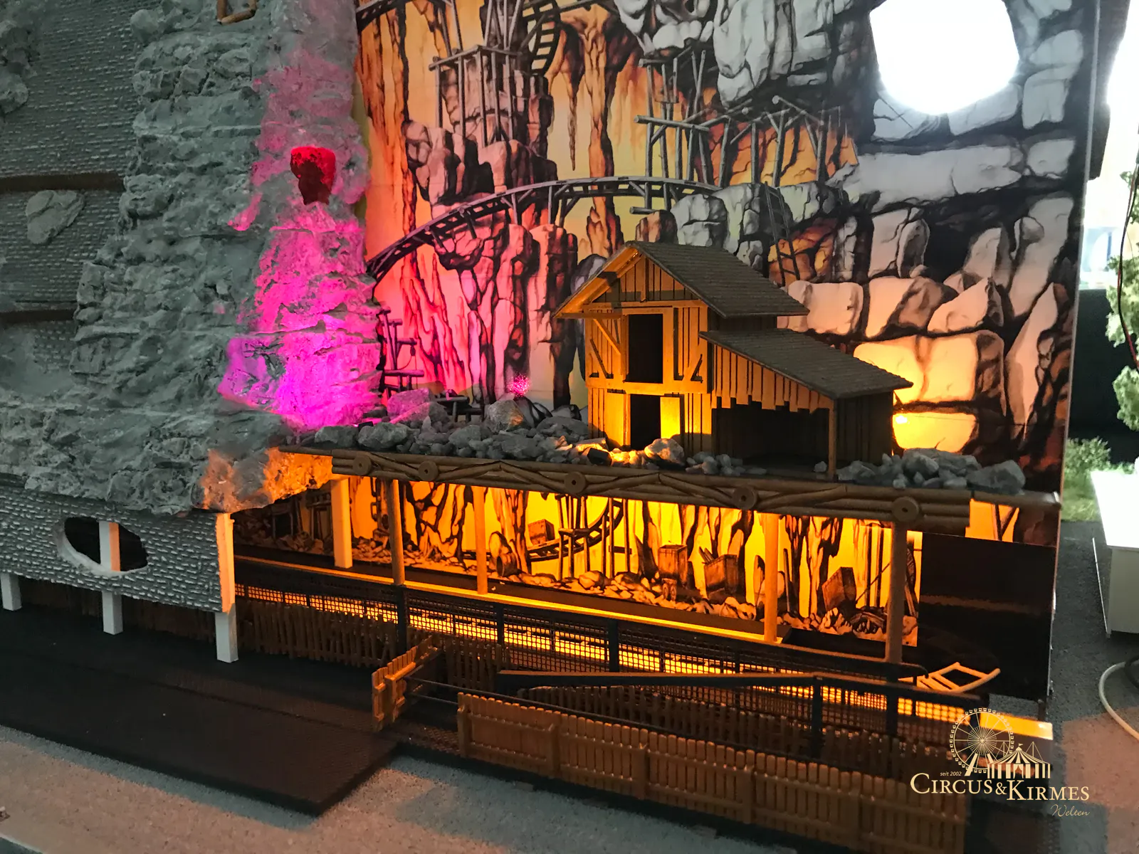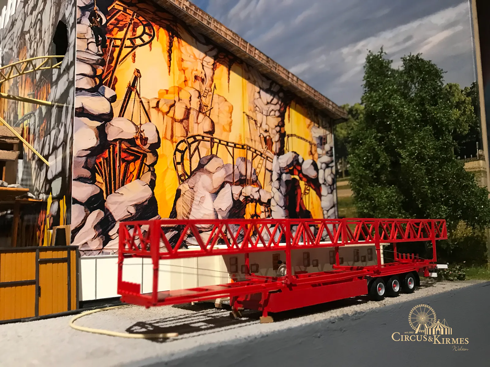 Nach zahlreichen Arbeitsstunden entstand dieses detailgetreue Modell des bekannten Fahrgeschäfts Höllenblitz im Maßstab 1:87. Es handelt sich um einen kompletten Eigenbau – von der Grundkonstruktion über die Antriebs- und Beleuchtungstechnik bis hin zur aufwendigen Gestaltung der Fassade und Szenerie.